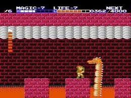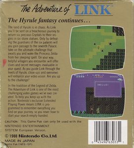 remarques: | le 2ème volet des aventures de Zelda (alias Link) in the land of Hyrule qui doit trouver 6 crystaux précieux dans 6 différents temples avant d'entrer le dernier temple pour combattre Gannon (en fait le double de Zelda) il y a six temples en difficultée croissante: 1/ le Parapa palace, boss Horsehead, avec la bougie 2/ le Swamp palace, boss Helmethead, avec les gants de force 3/ le Graveyard palace, boss Ironknuckle, avec le radeau 4/ le Island palace, boss Carock, avec les bottes 5/ le Water palace, boss Gooma, avec la flûte 6/ le Hidden palace, boss Barba le dragon, avec la croix sacrée 7/ le Great palace, boss Thunderbird et double de Zelda, en plus, il faut développer la magie et les coeurs jusqu'au chiffre de huit et trouver la ville fantôme de Kasuto au départ, on a trois vies à consommer mais il y a 4 poupées Zelda à trouver qui donne chacune une vie supplémentaire n.b. la meilleure tactique consiste à progresser sans combattre les boss de chaque temple (on reçoit une vie supplémentaire en éliminant un boss) et ne combattre le boss que du dernier temple, puis en allant combattre les boss restants tout en collectant les poupées, de ce fait on dispose de plus de force et de magie ainsi qu'environ 12 à 14 vies pour le dernier labyrinthe (que l'on ne peut pénétrer qu'après avoir battu les 6 boss du premier niveau) car ce dernier layrinthe est le plus difficile de tous, de plus, pour y parvenir, on doit franchir des territoires terriblement difficiles >> un jeu toujours aussi intéressant dans la série des Zelda Information Zelda II: the adventure of Link sur Nes nous fait retrouver les bottes du héros d'Hyrule, le grand Link, partez à la recherche de la Triforce pour réveiller la princesse Hyrule, plongée dans un sommeil profond tandis que les sbires de Ganon tentent de ressusciter leur maître, le titre propose une carte du monde, une vue de côté permettant un défilement horizontal et introduit des éléments qui deviendront cultes dans la suite de la série |