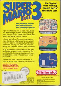 remarques: | Super Mario Bros. 3 se situe après les évènements des trois jeux précédents de la série, Mario et Luigi s'embarquent dans une mission sous le nom de la Princesse Peach pour arrêter Bowser et ses enfants, les Koopalings, qui terrorisent les sept régions du royaume Champignon, les Koopalings transforment les souverains en animaux après avoir volé leurs sceptres magiques, chaque région sert de monde divisé en niveaux, et une huitième région, le Pays Obscur, est le monde final, chacun des huit mondes est caractérisé par un thème visuel distinct; par exemple, le deuxième monde, le Pays du Désert, contient des niveaux couverts de sable avec des pyramides alors que les niveaux du quatrième monde, le Pays des Géants, sont peuplés d'obstacles et d'ennemis quatre fois plus grands que ceux des autres mondes Super Mario Bros. 3 est un jeu de plates-formes à défilement horizontal dans lequel le joueur contrôle le personnage à l'écran, Mario ou Luigi, d'une perspective à la troisième personne, il est similaire aux précédents jeux Super Mario, mais en plus des mouvements de course et de saut, le joueur vole et flotte dans l'air grâce à des objets spéciaux, glisse le long des pentes et exécute des nouveaux types de saut le joueur progresse dans le jeu en avançant dans les niveaux, accessibles depuis une carte du monde dans lequel il se trouve, la carte du monde montre une représentation du monde dans lequel se trouve le joueur vu de dessus, il y a plusieurs chemins menant de l'entrée du monde à un château, les chemins conduisent à des scènes d'actions, à des forteresses et à d'autres régions, offrant au joueur la possibilité de prendre différents parcours pour atteindre la fin du monde terminer les niveaux permet au joueur de progresser sur la carte du monde et à travers les mondes successifs, chaque monde se termine par un niveau final avec un boss à combattre, dans les sept premiers mondes, le boss est un des Koopalings que le joueur combat dans un bateau volant, alors que le joueur affronte Bowser, dans son château, dans le dernier monde, parmi les autres icônes de la carte, on trouve de gros rochers et des portes verrouillées qui bloquent le chemin ainsi que des mini-jeux spéciaux qui fournissent au joueur une chance d'obtenir des power ups spéciaux; l'option de conserver les power ups obtenus dans les mini-jeux via un menu accessible depuis la carte du monde est une nouveauté; en plus des objets spéciaux venant des jeux précédents comme le Super champignon et la Fleur de feu, des nouveaux power ups apportent au joueur des options inédites, par exemple, les champignons 1-up, qui donnent une vie supplémentaire au joueur, ceux-ci sont nombreux alors que les flûtes, qui servent à passer certains mondes, apparaissent seulement à trois reprises dans le jeu, la super feuille et le costume de Tanuki donnent respectivement à Mario une apparence de raton laveur et de tanuki et lui servent à voler et à se transformer en pierre pour éviter les ennemis pendant un court instant, quand Mario se change en statue de Tanuki pendant un saut, il s'écrase au sol et tue les ennemis se trouvant sous lui, il y a aussi le costume de grenouille, qui améliore la vitesse et l'habileté du personnage sous l'eau tout en augmentant la hauteur des sauts, il y a aussi le costume de marteau, qui donne à Mario l'apparence d'un frère Marto et lui permet de jeter des marteaux sur les ennemis et de résister aux attaques de feu. >> c'est un très bon jeu avec Super Mario mais peut'être pas aussi imaginatif que Super Mario 2 qui reste exceptionnel, toutefois graphisme et musique de Super Mario 3 (qui est maintenant devenu en quelque sorte un raton-laveur) sont toujours très bien, à regretter le manque d'un mot de passe avec sauvegarde |
