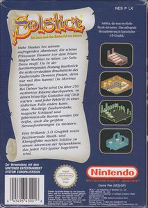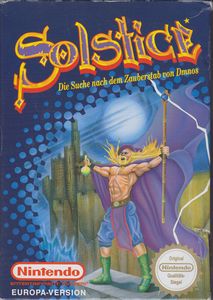 remarques: | Solstice: the quest for the staff of Demnos est un jeu vidéo d'aventure/réflexion, développé par Software Creation Ltd., sorti en 1989 sur Nintendo le jeu commence après l’enlèvement de la princesse Eleanor par le démoniaque sorcier Morbius qui souhaite la sacrifier dans un rituel lors du solstice d’hiver et ainsi obtenir les pouvoirs qui lui permettent de dominer le monde; pour sauver le monde, le joueur incarne le sorcier Shadax qui a pour seule solution de retrouver les six morceaux du sceptre de Demnos dispersés par les anciens dans le château de Kâstleröck: la demeure de Morbius Shadax ne possède pas de pouvoir, ses seules capacités sont le saut et la possibilité d’attraper certains cubes, il possède aussi quatre potions magiques (arrêt du temps, destruction des ennemis, i invincibilité durant quelques courts instants et révélateur de passage secrets), le joueur doit traverser, avec un nombre de sauvegardes limité (et fixé à certaines salles), un niveau unique de 250 salles en 3D isométrique sur plusieurs étages (caves, jardins etc.) dans le but de récupérer les 6 morceaux de sceptre, certaine salles nécessitent une certaine réflexion et une étude de la perspective >> un jeu passionnant qui demande vraiment de la réflexion et un jeu de patience aussi, rendu plutôt difficile par la perspective en 3D n.b. en tout cas plus difficile que Lightcrusader sur Sega, un jeu très similaire à Solstice |