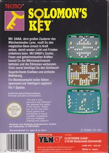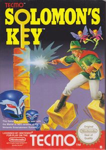 remarques: | Solomon's Key est un jeu vidéo de plate-forme/réflexion, développé et commercialisé par Tecmo en 1986 sur borne d'arcade, ce jeu a eu une suite dont le titre original est "solomon no kagi 2", cette fois le principe est d'éteindre des flammes dans une centaine de salle en manipulant et créant des blocs de glace le personnage principal, Dana, est envoyé pour retrouver la clef de Solomon afin de restaurer le monde envahi par des démons qui ont été accidentellement libérés; il y a 64 niveaux au total avec 15 étant secrets, les principaux niveaux sont divisés en groupes de 4 avec un groupe pour chaque constellation astrologique (dans l'ordre, bélier, taureau, gémeaux, cancer, lion, vierge, balance, scorpion, sagittaire, capricorne, verseau et poisson), le dernier niveau est appelé la chambre de Solomon, chaque constellation a une salle de bonus secrète qui ne peut être accessible que par un phoque de la constellation dans la dernière salle du groupe, les trois autres niveaux sont la page du temps, la page de l'espace et la salle de la princesse qui ne se présentent que si le joueur a acquis les sceaux cachés de Solomon le but du jeu est de parcourir ces cinquante pièces en trouvant dans chacune d'elles et dans un temps imparti la clef permettant d'ouvrir la porte menant à la pièce suivante, Dana peut courir, sauter, créer ou détruire des blocs devant lui ou créer des boules de feu pour détruire des démons, sur son chemin Dana peut acquérir des objets permettant d'améliorer son pouvoir, d'avoir des vies supplémentaires, d'obtenir des bonus ou encore de débloquer des pièces cachées >> mais c'est un jeu de dextérité où il faut être très rapide, donc avoir beaucoup de patience, de plus ni le graphisme ni la musique ne sont exceptionnels mais c'est quand même un jeu intéressant de par son originalité |