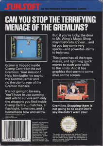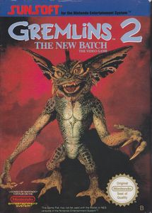remarques: | Gremlins 2 the new batch est un jeu vidéo d'action/plates-formes développé et édité par Sunsoft en 1990 sur Nintendo et Game Boy, il est inspiré du film Gremlins 2, la nouvelle génération Gizmo est un mogwai qui se retrouve dans les bureaux du building Clamp, les mogwai, lorsqu'ils reçoivent de l'eau sur la tête, se multiplient et s'ils mangent après minuit, ils se transforment en gremlins, d'horribles monstres dangereux, Gizmo reçoit donc de l'eau sur la tête et ses "doubles" l'enferment dans les conduits d'aération, ensuite ils se transforment en gremlins et saccagent le building, Gizmo, incarné par le joueur, se doit de les retrouver et de les éliminer le jeu est en vue RPG, ce qui signifie que Gizmo se déplace sur l'axe horizontal et sur l'axe vertical, de plus, Gizmo est capable de sauter, ce qui rajoute une dimension de hauteur au jeu, chose rare à l'époque, le jeu se découpe en mondes (un monde équivalant à une section du building) et en niveaux (correspondant à un étage); dans les niveaux, Gizmo doit éviter des pièges classiques: trous, piques sortant du sol, objets pointus se déplaçant selon un trajet précis, arc électriques se produisant à intervalles réguliers, il rencontre aussi des Gremlins agressifs qu'il peut éliminer à l'aide d'objets qu'il récupèrera au cours du jeu (un arc, des flèches et des flèches enflammées), il peut aussi accéder parfois à des magasins lui permettant d'acheter différents objets qui facilitent sa tâche à la fin de chaque monde, il y a un boss à affronter et il y a au total quatre mondes >> un jeu qui mêle RPG et Action mais plus porté sur un jeu plateforme car il y a peu de problèmes de réflexion à résoudre, c'est malgré tout un jeu assez original mais pas exceptionnel (semblable à Goonies 2 mais peut'être un peu moins intéressant, un peu plus facile et contrairement à Goonies 2, il y a sur ce jeu la possibilité de sauvegarder |