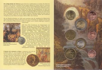 remarques: | la présente série d'épreuves a été produite pour présenter au public un exemple de frappe de monnaie, il s'agit d'épreuves qui n'ont pas de valeur légale spécifications 1 cent, 2 cent, 5 cent en cuivre 10 cent, 20 cent, 50 cent en laiton 1 Euro, 2 Euro en laiton/argent |