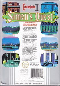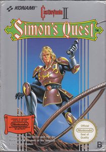 remarques: | la suite de Castlevania I sous le nom de Simon's Quest = Castlevania II le jeu est intéressant mais plutôt simple et facile (en tout cas beaucoup plus facile que Castlevania I ou III) mais il a une certaine originalité et un charme particulier il y a 3 levels et 5 mansions à parcourir, il faut récupérer plusieurs objets afin de pouvoir entrer dans le repaire de Dracula qui est vraiment facile à battre tout comme Castlevania III, ce jeu est plutôt rare à trouver et a en conséquence une côte plutôt élevée Information Castlevania II: Simon's Quest is a platform-adventure video game produced by Konami, it was originally released for the Famicom Disk System in Japan in 1987 and for the Nintendo Entertainment System in North America in 1988, it is the second Castlevania title released for the NES, following the original Castlevania, set sometime after the events of the first installment, the player once again assumes the role of vampire hunter Simon Belmont who is on a journey to undo a curse placed on him by Dracula at the end of their previous encounter, with Dracula's body split into five parts after his defeat (rip, hearth, nail, ring and eyeball), Simon must find and bring them to the ruins of his castle to seal and defeat him |