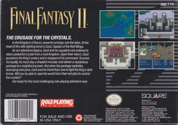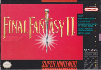 remarques: | dans le même genre que final fantasy III mais moins sophistiqué, un quatuor de caractères part à la recherche d'une épée magique pour vaincre le démon Zeremus passer à travers plusieurs niveaux, rechercher des armes et différents autres object, c'est surtout une suite interminable de combats peu d'énigmes à découvrir à part de nombreux passages secrets Information Final Fantasy II[a] is a fantasy role-playing video game developed and published by Squaresoft (1991) for the Family Computer as the second installment of the Final Fantasy series, the game has received numerous enhanced remakes for the WonderSwan Color, the PlayStation, the Game Boy advance, the PlayStation portable and multiple mobile and smartphone types, as neither this game nor Final Fantasy III were initially released outside Japan, Final Fantasy IV was originally released in North America as Final Fantasy II, so as not to confuse players the game's story centers on four youths whose parents were killed during an army invasion by the empire of Palamecia who are using hellspawn to conquer the world three of the four main characters join a rebellion against the empire, embarking on missions to gain new magic and weapons, destroy enemy superweapons, and rescue leading members of the resistance Final Fantasy II introduced many elements that would later become staples of the Final Fantasy franchise including chocobos and the recurring character Cid, it also eliminated the traditional experience point leveling system of the previous and later games in the series, instead introducing an activity-based progression system where the characters' statistics increase according to how they are used or acquired, despite being a sequel to Final Fantasy, the game includes no characters or locations from the first game, Final Fantasy II received little attention at the time from non-Japanese reviewers, though its remakes have garnered favorable reviews On the overworld and within dungeons, random encounters with enemies can be fought to improve each character's attributes unlike the original Final Fantasy, players cannot upgrade their characters' classes, the game is also one of the few games in the series to not use experience-based levels, instead, each character participating in battle develops depending on what actions they take, for instance, characters who frequently use a particular type of weapon will become more adept at wielding a weapon of that type and will also increase in physical strength and accuracy, attributes include hit points, magic points, magic power, stamina, strength, spirit, agility, intelligence, and evasion, hit points (HP) and magic points (MP) increase with their use; a character who takes a heavy amount of damage in a battle might earn an increase in maximum HP while a character who uses a lot of MP during battle might increase their maximum MP this experience system had several unintended consequences that allowed characters to gain much more experience than intended such as players having their characters attack each other and repeatedly cast spells, thus causing their HP and abilities to grow extensively Final Fantasy II uses the same turn-based battle system seen in the original Final Fantasy, with battle parties consisting of up to four characters at a time, the game also introduces a "back row" in battle within which characters or enemies are immune to most physical attacks but can be harmed with bows and magical attacks |
