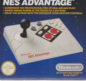 remarques: | NES advantage system with - repeat firing power at the touch of a button - delay the action with the exclusive slow motion control the NES Advantage is an arcade style controller released by Nintendo for the Nintendo Entertainment System in 1987, the device is meant to rest on a flat surface at a comfortable level, such as a tabletop or the floor, with the player seated behind it, this way, it could be used like an arcade game joystick, with the left hand using the joystick and the right hand operating the buttons |