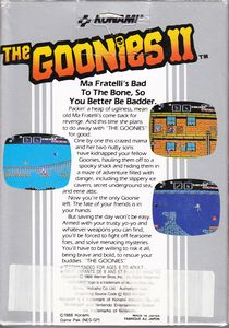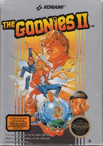 remarques: | the Goonies II est un jeu vidéo pour la Nintendo Entertainment System, sorti en 1987, développé et édité par Konami, il est la suite du premier jeu the Goonies qui n'est jamais sorti sur console en dehors du Japon, cela a conduit beaucoup de gens à croire qu'il était censé être une suite du film les Goonies, l'intrigue, cependant, se prête comme un possible deuxième chapitre de ce film, en tant que Mikey, votre quête est de sauver les six autres Goonies qui ont été enlevés par le gang Fratelli, récemment évadé de prison une fois de plus >> un jeu d'action où il faut trouver 6 goonies pour pouvoir libérer la sirène Annie, pas de grandes difficultées sauf les nombreuses "warpzones" qui font du jeu un vrai labyrinthe >> un jeu pas trop difficile et amusant Information The Goonies II (the Fratellis' last stand) is an adventure game developed and published by Konami for the Nintendo Entertainment System, it was released on March 1987 in Japan, November 1987 in North America, and on December 1988 in Europe it is a sequel to a prior Goonies video game released on the Family Computer in Japan, the game's story centers on Mikey, his friends, the Goonies, have been kidnapped by the Fratellis, an Italian family of small-time crooks and counterfeiters, Mikey must rescue all six of his friends and free a captured mermaid named Annie the Goonies II features two modes of play: platform and first-person, the player moves Mikey to new areas of the map by ladders or doors that may act as warp zones, several different types of zones are found in the game, each with distinct enemies, graphics and music the Fratelli family (Jake, Francis, Cousin Pipsqueak and Ma Fratelli) will frequently appear to pursue Mikey; with the exception of Pipsqueak who vanishes when hit, they can be stunned briefly with attacks but cannot be defeated when the player exits the platform screen by entering a door, the game shifts to a first-person mode, using a command menu similar to Shadowgate (released around the same time), the player explores the area by navigating through rooms, searching for hidden items and interacting with non-player characters, the items the player finds may be useful in the platform screens (such as weapons or transceivers) or within the rooms themselves (such as the candle, key and ladder), the player will find the six Goonies and eventually Annie in cells in this mode, each rescued Goonie increases Mikey's health and all six must be rescued before Annie can be freed Mickey can use three primary weapons: - the yo-yo, a short-range weapon with limited power; - the slingshot, a ranged, ammunition-based weapon; - the boomerang, a slower ranged weapon with unlimited use - the bomb and molotov cocktail are two secondary weapons the bomb can also reveal hidden doors (three of them: hyper shoes and 2 further lifes), the spring shoes are also needed and can be found by diving, the player must also find and use a diving suit in order to reach underwater areas of the hideout what the player has to do in order to obtain certain vital items is sometimes obscure, for example, the candle (an item necessary to finish the game) is obtained when Mikey hits a specific old woman five times in a row for no apparent reason |