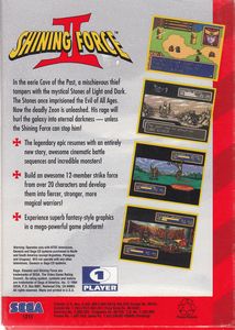 remarques: | encore meilleur que Shining Force I, plus étendu, plus recherché, plus de possibilités mais aussi plus difficile c'est le même genre que le premier mais en plus des combats de nouveau genre et une quête de pierres mithril (15) qui permettra d'acquérir des armes spéciales vers la fin du jeu; au fond c'est le seul point faible du jeu: car pour acquérir ces armes spéciales, il faut beaucoup de temps on peut encore mentionner deux difficultés dans le jeu: a) le combat sur le radeau b) le combat dans l'étang de la fée c) le combat sur l'échiquier du jeu d'échec d) le combat contre Lemon, the red baron il y a 4 genres de difficultés, la plus difficile étant "ouch", on peut encore corser la difficultée en essayant tout comme dans le premier jeu de ne pas subir de pertes dans son propre team lors des combats n.b. encore plus difficile que "ouch" est la sélection de "super" car les ennemis attaquent avec une force de 25% en plus, se tournent toujours vers les joueurs les plus faibles et attaquent plus souvent, le dernier combat contre le monstre final étant probablement le plus difficile malheureusement, il n'y a pas eu de suite tel que Shining Force III dans Sega Genesis, il y a eu une suite nommé Shing Force III mais seulement dans le système Sega Saturn |
