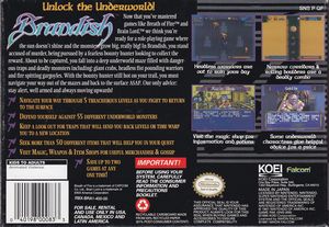 remarques: | jeu RPG un peu spécial qui se joue en double perspective: "latérale" et "en rotation" il faut traverser 42 zones pour arriver au monstre final "king Berebus" après avoir résolu des puzzles et énigmes et surtout après de nombreux combats (notamment les 2 zones "dark" sont assez difficiles à traverser). il faut également choisir des armes et autres instruments pour augmenter sa valeur combative durant le jeu 2 personnages se trouvent en compétition durant ce jeu: Varik le héros dont on contrôle le parcours et Alexis sa concurrente qui le devance toujours durant le jeu pour finalement se joindre à Varik. c'est un jeu assez intéressant de par son originalité, sa longueur aussi (env. 38 heures de jeu), mais une assez bonne musique le maniement au début est un peu compliqué mais on s'y habitue assez vite. jeu plutôt rare, il n'existe qu'une version en anglais Brandish I alors qu'il y aurait 2 versions en japonais Brandish I and II |