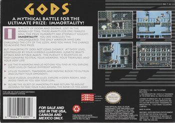 remarques: | Gods, a mythical battle for the ultimate prize: immortality, also known as Gods into the wonderful, is a 1991 video game by Nintendo/the Bitmap Brothers where the player is cast as Hercules in his quest to achieve immortality, like other Bitmap Brothers' games, Gods was highly praised by critics, thanks to the quality graphics and music Gods is a platforming/action game in which you move about and kill enemies in a level-based format, it is different from the majority of action games because of discovering secrets, finding keys, opening doors, and even a system of shops and currency, these alone do not isolate its style, it needs alot of quick reflexes, mainly in handing the fights presented to you at the start you have only three livres and if you die, you have to restart the level in which you end, there are four levels: the city, the temple , the labyrinth and the underworld, each with three areas and a final boss the final boss (a giant skull) is a big challenge, but as for the other guardians, you do not have to completely restart the fight, the points inflicted to the boss will remain for the next fight as the game is really a great challenge, it is recommended to use the Game Genie code: C269-C1EB >> a normal action game but with good design and music |