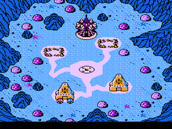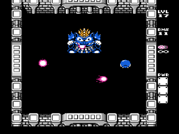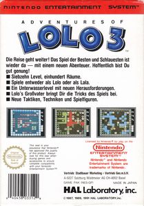 remarques: | la troisième et dernière série sur les aventures de Lolo, cette fois c'est devenu plus difficile et plus vaste avec au total 100 chambres à maîtriser, mais toujours intéressant et avec une bataille finale contre Egger plutôt >> le dernier jeu NES avec Lolo, il y aurait aussi un Lolo II prof, mais difficile à trouver Information adventures of Lolo 3, known as adventures of Lolo 2 in Japan, is a puzzle video game released in 1991 by HAL Corporation for the Nintendo Entertainment System, it is based on the Japanese Eggerland video game series, it is the third instalment of the adventures of Lolo series released in the U.S. New gameplay, elements were added to make the base gameplay deeper than before, however, in 1994, a game titled "adventures of Lolo" was also released for Game Boy in Europe and Japan, said Game Boy release was not the same game as the original NES release of the same name, but rather a fourth sequel in the series with continued additions to the base gameplay in Japan, this game was released as the adventures of Lolo 2 because adventures of Lolo was not released in Japan, additionally, the Japanese version of the game had a different difficulty curve and featured different stages Lolo and Lala are enjoying some time together when the Great King of Eggerland's son and heir throws a potion on all of Lolo and Lala's friends, turning them to stone, Lolo and Lala return home to see the damage that the Great king's son and heir has done, embark on a quest to stop him and return their friends to normal, to note that in the last stage, Lola takes over and will deliver Lolo the player has the ability to select between playing as Lolo or Lala in the levels, neither character has any advantage over the other, however, the only difference being in the tutorial levels two changes to the gameplay included the crumbling bridge, which is a bridge that can only be crossed two times before it crumbles into nothingness, the other change was a new monster called Moby, mobies only appear in the underwater levels and use a line of sight attack that sucks Lolo in towards them, though not directly a fatal attack, it can cause Lolo to get stuck and have to restart the room when pressing select to give up, Lolo does not actually die this time, instead, a short "give up" tune plays and the level restarts, pressing Start will return the player to the overworld map, pressing Start again reveals the password to that point in the game, adventures of Lolo 3 uses 16-character passwords instead of four-character ones the game features a total of 17 levels with 100 different puzzle rooms, nine boss rooms and ten training rooms, levels 3, 13, and 17 have ten rooms each, the other levels only have five rooms, levels 4-7, 9-12, and 17 have a boss at the end, the two big trees on the overworld map are where the training rooms are, each tree having five rooms each |