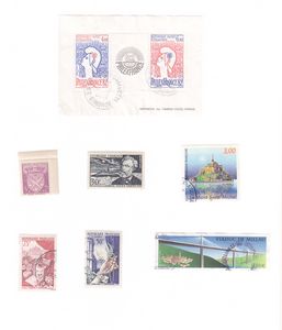 remarques: | - Europa - timbres verticaux divers: régions, santé, vaccin, handicap, société, police, religion, églises, monuments, évènements, etc - deuxième guerre mondiale et résistance (FFL Levant, commémorations, De Gaulle, résistance, camps de concentration, libération, armement, maréchaux, etc) - Régime de Vichy (Pétain) et autres figures militaires - enveloppe FDC Leclerc, FDC résistance (île de Sein) et déportation >> enveloppe libération de Strasbourg 1944-2004 >> voir aussi album XIII - timbres horizontaux divers: régions, architecture, monuments, châteaux, personnages, commémorations, etc) - poste aérienne (avions, satellites, airbus, aviateurs, etc) - Mariannes et armoiries françaises dont avec surcharge: a) Lille, Rouen, Bordeaux, Toulouse, Clermont-Ferrand, Marseille, Lyon, Rennes, Reims, Montpellier, Paris, Nancy b) Chambéry, La Rochelle, Poitiers, Orléans, Grenoble, Angers, Dijon, Limoges, Le Havre, Nantes, Nice, Saint-Etienne timbres divers: - fête et journée du timbre, fête du livre - bloc Philex France 1982 - bloc communication - jeux olympiques Albertville - recyclage, scoutisme - jeux video - tourisme, sites touristiques, phares - économie, politique, éducation, conférences, sciences, divers - gastronomie - littérature, peinture - anniversaires, meilleurs voeux, vacances - sites touristiques (St-Michel, viaduc de Millau, Haut-Koenigsburg, etc) - fruits (poire, pomme, melon) - paysages, folklore, artisanat (broderie, coutellerie, etc), métiers, statues, coiffure, instruments de musique, divers - série ganterie, tapisserie, édition livres, porcelaine et cristaux, joaillerie et orfèvrerie, fleurs et parfums, verrerie, etc Annexes - légion des volontaires front de l'est, général Koenig, France de Vichy, Leclerc maréchal de France - timbres divers poste aérienne française - divers: Philex France 1982, viaduc de Millau, joaillerie et orfèvrerie, mont St-Michel, Jules Verne, etc) |