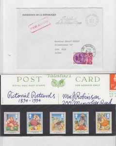 remarques: | U) collections - petit guide du collectionneur philatélique - achats, ventes, valeurs, foires du timbre, - liste de recherche V) documentation philatélique - le timbre-poste, impression, graphisme, héliogravure, défauts d’impression, timbres rares - timbres divers (Black Penny 1840, Basler Dybli 1845, Caraïbes, Islande, Marianne, Mauritius) - thèmes philatéliques, Schweizer Briefmarken Zeitung 1987, catalogue Sieger: les timbres du monde, sociétés philatéliques W) timbres suisses sur enveloppe - 2 enveloppes 1874 Genève/Satigny - Porrentruy 1957, Mustermesse 1960, - diverses enveloppes premier jour d’émission 1961 à 1971 - dont CEPT, pro Juventute, pro Patria, Croix Rouge - blocs 1962, 1963,1965 - Fête du Peuple Jurassien 1973 & 1979, - Escalade Genève 1975 - blocs Fasnachts Comité 2010, - 100ème Marché Concours 2003 - divers blocs 1990 et 1991 - Mont soleil & Courtelary - Gemmi monté d’alpage, - enveloppe Niklaus von Flüe, jour d'émission 1987 - enveloppe Oberwil, blocs Suisse 700 ans, - diverses enveloppes année 1970 à 2010 - Schliessung Postamt Brislach 2009 XZ) timbres étrangers sur enveloppe - 3x Liechtenstein, 1 block Nouvel An chinois - 3x France, 1x présidence de la République, - 3x Monaco (centenaire Lourdes, ville Monaco 1954, avènement Rainier 1960) - 2x San Marino first day of issue (Dante et Tiziano Vecellio), - 2x Belgique, 2x Italy, 1x Espagne, - 1x Ireland, 1x URSS - 1x UK, 1x picturial stamps, - 1x Isle of Man, - 1x Isle of Wight (Saunder-Roe), - 1x Suède, 1x Lithuanie, 1x Islande, - 2x Allemagne, 4x Autriche, - 1x China, 1x Taiwan 1x Indonesia, - 1x Cambodia, 1x Thailand, - 1x Polynésie française, - 2x Nepal, 1x Srinagar, 1x Iran, - 2x Turkey, 1x Israel, 1x Uganda WWF - 11x USA, 3x Canada, 1x Honduras, - 1x Australia, 1x NewZealand, - 1x Cuba, 1x Mexico, 2x Uruguay, - 2x Venezuela, 4x Argentina Annexes a) Fasnachts Comité 2010, 100ème Marché-Concours 2003 b) présidence de la République Française 1984, royal mail pictorial postcards 1894-1994 c) centenaire de Lourdes Monaco 1958, centenario San Marino Dante 1965 d) enveloppe des USA Timberline 1964, enveloppe de Chine 1990 |