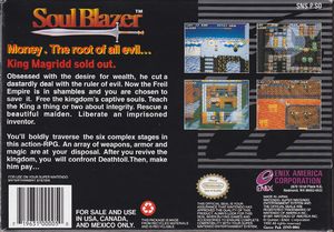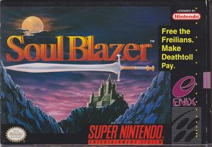 remarques: | un jeu de rôle pas trop difficile sauf le boss final pour qui il faut plusieurs tentatives avant de pouvoir l'éliminer le graphisme n'est pas terrible, mais par contre le jeu donne une très belle musique d'orgue Soul Blazer est un guerrier qui doit libérer des âmes (d'où le nom soul blazer) à travers six villages avant d'atteindre le monde du démon, le but ultime étant de recevoir le Phoenix afin de pouvoir lutter contre le Démon Deathtoll les personnages: - le héros soul Blazer - dr. Leo (référence à Leonardo da Vinci) - sa fille Lisa (référence à Mona Lisa) - le roi Magridd qui a voulu composer avec Deathtoll - the Master est le maître du ciel qui accompagne Soul Blazer pour le protéger ete il y a aussi le chien Turbo, la poupée Marie, Nome l'escargot, Lue le dauphin il faut aussi trouver 6 pierres précieuses pour pouvoir atteindre les 6 village 1/ la plaine de Grass Valley 2/ la forêt de Greenwood 3/ l'aire maritime de Seabed Sanctuary 4/ les montagnes de neige de Mountain Spirit 5/ le laboratoire du dr. Leo 6/ le château de Magridd il n'y a pas de grands problèmes à résoudre, c'est une course aux objets et aux âmes, dans chaque niveau est indiqué le nombre d'âmes à libérer et le développement du jeu est facilité par un grand nombre de points que l'on peut sauvergarder, par contre on ne reçoit qu'une seule provision en cas de perte des vies (on ne peut donc survivre qu'une fois) |