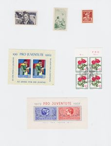remarques: | 1) timbres PRO JUVENTUTE 1912 et + en 1912, création de Pro Juventute pour aider les enfants suisses handicapés, timbres précurseurs, en 1913, premier timbre = buste de l'Helvetia costumée avec Cervin - 1912 timbres précurseurs (allemand, français,italien = 3 couleurs) >>> manque le timbre italien «un anno di sole» (fr 1000.-) - 1913 Helvetia buste avec Cervin - 1915 appenzellois et lucernoise - 1916 fribourgeoise, vacher bernois et vendangeuse vaudoise - 1917 valaisanne, unterwaldienne et tessinoise - 1918 Uri et Genève - 1919 Nidwald, Vaud et Obwald - 1920 Schwytz, Zürich et Tessin - 1921 Valais, Berne et Suisse (Rudolf de Habsbourg et Guillaume Tell) - 1922 Zoug, Fribourg, Lucerne et Suisse (Winkelried et Leopold d'Autriche, bataille de Sempach) - 1923 Bâle-Ville, Glaris, Neuchâtel et Suisse (guerrier suisse et Louis XI bataille de St-Jacques sur la Birse) - 1924 Appenzell Rhodes-Intérieures, Soleure, Schaffhouse et Suisse (guerriers suisse et burgonde, guerres de Bourgogne) - 1925 St. Gall, Appenzell Rhodes-Extérieures, Grisons et Suisse (guerriers suisses de la campagne milanaise, guerres d'Italie) - 1926 Thurgovie, Bâle-Campagne, Argovie et Suisse (lion de Lucerne rendant hommage à la garde suisse, bataille des Tuileries) - 1927 commémoratifs Pestalozzi (orphelin abandonné, orphelin à l'école, Jean-Henri Pestalozzi) - 1928 écussons de ville (Lausanne, Winterthour, St-Gall) et Henri Dunant - 1929 paysages et Nicolas von der Flüe (lac de Lugano, lac d'Engstein, Lyskamm) - 1930 écussons de ville (Fribourg, Altdorf et Schaffhouse) et Jeremie Gotthelf - 1931 paysages et Alexandre Vinet (Silser+Silvaplanersee, Well- und Wetterhörner et lac Léman) - 1932 sujets sportifs (lanceur de drapeau, lanceur de pierre et lutteurs) et Eugène Huber - 1933 costumes et Gregoire Girard (vaudoise, bernoise et tessinoise) - 1934 costumes et Albert de Haller (appenzelloise, valaisanne et grisonne) - 1935 costumes et Stefano Franscini (bâloise de la campagne, lucernoise et genevoise) - 1936 costumes et Jean-George Nägeli (neuchâteloise, schwytzoise et zurichoise) - 1937 têtes de garçon et de fille, genéral Dufour et Nicolas von der Flüe + bloc avec légende >> p.13 - 1938 costumes et Salomon Gessner (st-galloise, uranaise et argovienne) - 1939 costumes et général Herzog (fribourgeoise, nidwaldienne et bâloise de la ville) - 1940 costumes et Gottfried Keller (thurgovienne, soleuroise et zougoise) - 1941 costumes, Daniel Jeanrichard et J.G. Lavater (schaffhousoise et obwaldienne) - 1942 costumes, N. Riggenbach et Konrad Escher von der Linth (appenzelloise rhodes extérieures et glaronaise) - 1943 fleurs des alpes et E. von Fellenberg (chardon, sabot de Venus et gentiane) - 1944 fleurs des alpes et Numa Droz (edelweiss, lis martagon et ancolie des Alpes) - 1945 fleurs des alpes, Louis Forrer et Suzanne Orelli (rosier des Alpes et safran printanier) - 1946 fleurs des alpes et Rodolphe Toepffer (narcisse, joubarbe et chardon bleu) - 1947 fleurs des alpes et Jakob Burckhardt (auricule, lis orangé et cyclamen) - 1948 fleurs des alpes et général Wille (digitale à grandes fleurs, rhododendron et paradisie faux-lis) - 1949 fleurs des alpes et Niklaus Wengi (anémone, clématite des Alpes et oeillet) - 1950 papillons, abeille et Theophil Sprecher von Bernegg (vulcain, lichenée, abeille et solitaire) - 1951 papillons, libellule et Johanna Spyri (demoiselle, flambé, aurore et grand paon de nuit) - 1952 papillons, coccinelle et portrait de garçon (coccinelle, demi-deuil, argus argenté et bombyx du chêne) - 1953 papillons, scarabée et portrait de fille (nonne, morio, longicorne) et Ferdinand Hodler - 1954 papillons, bourdon et Jeremias Gotthelf (écaille martre, bourdon, ascalaphe et machaon) - 1955 papillons, guêpe et Pictet-de-Rochemont (paon de jour, sirex, écaille jaune et apollon) - 1956 papillons, scarabée et Carlo Maderno (zygène, petit-mars, carabe et piéride du chou) - 1957 papillons, scarabée et Leonhard Euler (le soufré, zérène du groseiller, cétoine dorée et la mariée) - 1958 fleurs et Albrecht von Haller (pensée, reine-marguerite, volubilis et rose de Noël) - 1959 fleurs et Karl Hilty (populage des marais, coquelicot, grande capucine et pois de senteur) - 1960 fleurs et Alexandre Calame (dent-de-lion, phlox, dauphinelle et pomme épineuse) - 1961 fleurs et Jonas Furrer (tournesol, muguet, iris et potentille ansérine) - 1962 50 ans Pro Juventute (branche de pommier, enfant et son univers 2x, mère et enfant, forsythie + bloc mère et enfant >> p. 13) - 1963 fleurs et portrait de garçon (grande marguerite, géranium, bluet et oeillet) - 1964 fleurs et portrait de jeune fille (narcisse jaune, rose, trèfle rouge et nénuphar blanc) - 1965 animaux sauvages indigènes (hérisson, marmotte, cerf, blaireau et lièvre variable) - 1966 animaux sauvages indigènes (hermine, écureuil, renard, lièvre et chamois) - 1967 animaux sauvages indigères (chevreuil, martre, bouquetin et loutre) + block tte série oblit. et neuf >> p. 9 - 1968 oiseaux indigènes (grand tétras, bouvreuil, pie grèche et roitelet) - 1969 oiseaux indigènes (chardonneret, loriot, tichodrome et geai) - 1970 oiseaux indigènes (mésange bleue, huppe fasciée, pic épeiche et grèbe huppé) - 1971 oiseaux indigènes (rouge-queue, gorge-bleue, faucon pélerin et canard sauvage) - 1972 roses (Mc Gredy’s sunset, miracle, papa Meilland et madame Dimitriu) - 1973 fruits de la forêt (châtaigne, merise, mûre sauvage et myrtille) + bloc >> p. 10 - 1974 plantes vénéneuses de la forêt (bois gentil, belladone, cytise et gui) - 1975 journée du timbre et plantes de la forêt (brante postale, hépatique, sorbier, ortie jaune et faux platane) - 1976 plantes médicinales de la forêt (épine-vinette, sureau noir, tilleul et pulmonaire) - 1977 roses (rosa foetidia, rosa à parfum, rosa persiana et rosa centifolia) - 1978 armoiries de communes 1) (Aarburg/AG, Gruyères/FR, Castasegna/