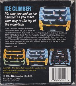 remarques: | un des premiers jeux de plates-formes développé par Nintendo, version arcade il est possible de faire jouer soit avec une personne soit avec deux personnes les deux personnages de Popo et Nana en habit d'eskimo, il faut grimper des montagnes (plus de 30 montagnes) sans tomber sur un chemin jonché d'ennemis et d'obstacles pour détruire tout au sommet un condor diabolique >> le jeu est particulièrement difficile demandant beaucoup d'adresse et de patience (surtout pour les sauts parfois sur des terrains glissants et sur des nuages difficiles à atteindre), de plus on est limité en temps et on ne peut pas sauvegarder le jeu, par contre on peut choisir le numéro des montagnes (1 à 32) un des dix premiers jeux développés par Nintendo |