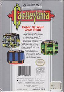 remarques: | il est le premier opus de la série Castlevania. En 1691, le comte Dracula ressuscite dans son château en Transylvanie, il commence à faire régner la peur et la désolation dans les villages voisins, lorsque le célèbre chasseur de vampires, Simon Belmont, apprend cela, il se rend au château de Dracula armé du fouet Vampire Killer afin de terrasser le démon, il lui faudra traverser tout le lieu, du portail à la chapelle en passant par les jardins et la bibliothèque infestés de pièges et de monstres pour mener sa quête à bien le joueur contrôle Simon Belmont, un célèbre chasseur de vampires armé du fouet "tueur de vampires" et d'attaques secondaires (croix, hache, eau bénite, etc.), ce jeu est structuré en six niveaux de 18 étages avec des trajets qui peuvent diverger, sur le trajet se trouvent de nombreux ennemis et de nombreux pièges et à la fin de chaque niveau, on se retrouve face à un boss pour finir à la fin contre le "big boss" Dracula constitué de deux parties à battre, ce jeu est considéré comme un des meilleurs jeux plate-formes sur le NES, il y en aura 3 + Castlevania IV sur les SNES >> un jeu qui demande de l'habilité et de la patience, un peu plus court et moins varié que le Castlevania III qui sortira en 1989 et sur celui-ci,on ne peut pas sauvegarder la partie et si on veut poursuivre le jeu, il faut toujours repartir d'un niveau qui comprend généralement trois étages, graphisme et musique assez intéressant mais un jeu pour les fanatiques du genre n.b. Castlevania II sera un jeu intermédiaire entre le I et le III et un peu moins difficile mêlé quelque peu avec certains problèmes à résoudre et un trajet un peu plus compliqué (voir Simon's Quest) |