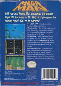 remarques: | Megaman ou Mega Man (de son nom original Rockman) est une série de jeux vidéo de plate-forme originellement créée par Akira Kitamura, pour la compagnie de jeux japonaise Capcom, ayant notamment révolutionné le concept de jeu de plate-forme et comportant 126 titres pour un total de copies vendues de 28 millions en date du 27 avril 2010, la franchise Megaman est l'une des plus populaires du domaine vidéoludique, il existe, à l'heure actuelle, sept séries de Megaman dont six séries dérivées en 20XX, un androïde très avancé du nom de Rock se fait transformer en robot de combat par son créateur, le professeur Light, pour affronter les armées de robots du sinistre professeur Wily, il devient alors connu sous le nom de Megaman commencée en 1987 avec la sortie de Megaman, la série originale, dite "classique", compte plus d'une vingtaine de jeux, dont une dizaine sur console de salon et cinq sur Game Boy, sans compter les nombreux remakes, portages et rééditions Mega Man se compose de six niveaux de plateforme à défilement horizontal, dans chaque niveau, le personnage-joueur, Mega Man, se bat contre différents ennemis et obstacles avant d'affronter un boss "Robot Master" à la fin du niveau à noter que le joueur est libre de procéder à travers le jeu dans n'importe quel ordre, chaque "master robot" étant vulnérable à une arme spécifique et lorsque les six niveaux ont été achevés, la septième et dernière étape apparaît sous le nom "Wily Forteresse" avec quatre étages reliés entre eux et contenant chacun à nouveau le boss des 6 niveaux devant être combattu dans un ordre prédéterminé avant l'affrontement final contre le Dr Wily. les boss des 6 niveaux: Cutman, Gutsman, Elecman, Iceman, Fireman et Bombman >> le premier jeu Megaman extrêmement difficile, probablement le plus difficile de la série Nes, demandant de l'habilité et de la patience et surtout toujours sans sauvegarde n.b. liste des jeux Mega Man: - Mega Man (Rockman), Famicom/NES, 1987 - Mega Man 2 (Rockman 2: the enigma of dr. Wily), Famicom/NES, 1988 - Mega Man 3 (Rockman 3: the end of dr. Wily), Famicom/NES, 1990 - Mega Man 4 (Rockman 4: a new ambition), Famicom/NES, 1991 - Mega Man 5 (Rockman 5: blues' Trap), Famicom/NES, 1992 - Mega Man 6 (Rockman 6: the greatest battle in history), 1993) - Mega Man 7 (Rockman 7: fated confrontation), SNES 1995 - Mega Man 8 (Rockman 8: metal Heroes), Playstation & Sega 1996 - Mega Man 9 (Rockman 9: revival of ambition), WiiWare & PlayStation, 2008 - Mega Man 10 (Rockman 10: threat from outer space), WiiWare & PlayStation, 2010 |