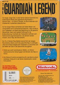 remarques: | the Guardian Legend est un jeu vidéo développé par Compile sous la direction de Masamitsu Niitani et sorti en 1988, le jeu se déroule en deux phases distinctes, une où l'on dirige l'héroïne à pied en genre action-aventure et une ou l'on dirige un vaisseau et qui est de genre shoot them up, le joueur contrôle une jeune femme qui doit empêcher Naju, une planète extraterrestre, d'entrer en collision avec la Terre. Alyssa est une jeune femme androïde gardienne de la Terre qui a la capacité de se transformer en vaisseau spatial, elle est envoyée sur Naju afin d'empêcher la planète d'entrer en collision avec la Terre, après un premier combat contre un système de défense, l'héroïne se pose enfin et en arrivant sur Naju, elle découvre un message d'un habitant enregistré sur un ordinateur, le message explique qu'il faut lancer le système d'auto-destruction pour annihiler la planète et les extra-terrestres qui l'ont envahie en même temps, pour cela, il faut détruire les 10 systèmes de sécurité qui permettent de lancer la procédure, Alyssa parcourt alors la planète sur terre et dans les airs pour vaincre tous les extra-terrestres, après un ultime combat contre leur chef suprême, elle déclenche l'auto-destruction et sauve la Terre de sa fin tragique. le déplacement sur la surface de la planète se fait d'écran en écran, le passage d'un écran à l'autre s'effectue en marchant ou en utilisant des "portails de téléportation", une partie de ces portails nécessite l'utilisation d'une clé pour pouvoir être franchis, dans certains d'entre eux, des monstres apparaissent et attaquent le joueur, une petite partie de ces écrans contient des mini-boss qui font apparaître un objet une fois vaincu. la progression du jeu est sauvegardée à l'aide d'un code donné par des habitants de la planète, code caché dans certaines grottes, ce système est aussi présent dans des jeux comme Metroid ou Megaman, permet de ne pas avoir à faire l'aventure en une seule fois, une fois le jeu terminé un code nous est donné (TGL) pour pouvoir rejouer uniquement aux niveaux shoot them up (mais extrêment difficile et sans grand intérêt) >> un jeu donc mixte action/shoot-up, un jeu un peu spécial, pas toujours facile à s'y retrouver (surtout pour la sauvegarde avec code compliqué), curieusement le premier corridor à franchir pour arriver sur la planète Naju est le niveau le plus difficile, le reste du jeu est assez intéressant (deux étoiles pour son originalité) sauf pour le jeu supplémentaire (TGL) qui est fourni sans raison valable et sans intérêt n.b. un jeu plutôt rare et bien côté: Euros 60.- (avec boitier) |
