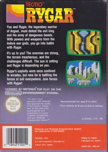 remarques: | Rygar = legendary Warrior?) est un jeu vidéo d'action/plates-formes développé et commercialisé par Tecmo en 1986; sur borne d'arcade, il a été porté sur divers supports familiaux, le sous-titre pour la version arcade est legendary warrior le joueur progresse de gauche à droite, allant de refuge en refuge, symbolisant la fin de chaque tableau, jusqu'au 27ème où le monstre géant final doit être vaincu, un temps est imparti pour se rendre d'un refuge à l'autre, en cas de dépassement de ce temps, la musique change, le décor devient plus sombre et un masque de mort invulnérable apparaît, balayant le tableau de gauche à droite de plus en plus rapidement et suivant une sinusoïde se dirigeant vers le joueur et il n'est pas possible de l'éviter outre les améliorations de l'arme, il est possible de récolter plusieurs perles, mais aussi des étoiles, le plus souvent dissimulées, des bonus sont obtenus après avoir collecté sept étoiles, il est aussi possible de trouver une vie supplémentaire qu'il faut vite attraper car elle disparaît rapidement, le jeu permet aussi d'obtenir des bonus calculés en fonction du nombre d'ennemis tués, comme dans la plupart des jeux d'arcade, la recherche du score maximum motive le joueur, cet aspect est relativement développé sur Rygar, en comparaison avec les autres jeux d'arcade de la même période la musique est du genre épique et rend bien l'atmosphère d'heroic fantasy du jeu (également pour le graphisme) >> le jeu est assez difficile et il faut pas mal de dextérité pour arriver à la fin, surtout qu'au-delà d'un niveau atteint, il n'est plus possible de continuer le jeu et il faut recommencer depuis le début ou du moins depuis le début d’un niveau, certaines critiques assument même qu'il n'est pas possible de tuer le monstre final dans la version européenne >>> à voir n.b. jeu testé sur console et en parfait état de marche |