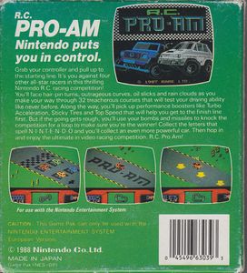 remarques: | R.C. Pro-Am est un jeu vidéo de course (racing video-game) développé par la société britannique Rare, il a été publié pour la Nintendo Entertainment System (NES) en 1988 présenté dans une perspective isométrique, un joueur contrôle une voiture radio-commandée sur une série de pistes; l'objectif de chaque joueur est de se qualifier pour la prochaine course en se plaçant dans les trois meilleurs coureurs, les joueurs peuvent recevoir des objets pour améliorer leur performance et ils doivent éviter une variété de risques tels que les flaques d'eau et les nappes de pétrole il existe aussi un mode de jeu dans lequel le joueur peut utiliser des voitures de combat avec missiles incorporés pour éliminer leurs concurrents initialement intitulé Pro Am Racing, R.C. Pro-Am a été également produit pour la Sega Mega Drive, un modèle amélioré (notamment pour le graphisme) avec des possibilités supplémentaires ce jeu a été mentionné par les critiques de jeux vidéo comme l'un des premiers titres NES réussies, RC Pro-Am a été bien accueilli de par son visuel, sa sonorité et son fonctionnement, il a été une source d'inspiration pour les futurs jeux comme Super Off Road, Rock n 'Roll Racing et la série Mario Kart, il était alors considéré comme un des meilleurs jeux de ce genre >> un jeu intéressant qui demande toutefois à nouveau pas mal d'habilité et il faut vraiment s'entraîner pour pouvoir maîtriser ce jeu (il a été bien sûr dépassé par le fameux Super Mario Kart Racing) |