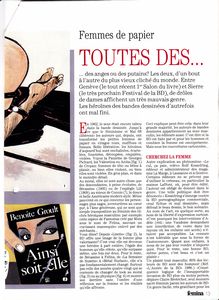 remarques: | dossier 459 les séries BD C) les parutions - innovations, best-sellers, les nouveautés, souvenirs, - rééditions, documents, albums spéciaux, - nouvelle vague et retro de la BD, les classiques, les intégraux, - bande-annonces, prix et sélection D) les genres (thèmes) de bande dessinée - l’Afrique, la BD adulte, l’Algérie, l’Amour, l’Angleterre, BD animalière, - l’Argentine - la Chevalerie, la Chine, l’Enfance, l’Espagne - Fantasy, Féminisme, Finances, Guerre, Histoire, Humour - les Indes, l’Italie, le Japon (les Mangas), Jeunesse - Musique, Nazisme, Polar, la Pologne, Racisme, Religion (la bible) - Science-Fiction, Sexe (la femme-objet, le porno), Sorcellerie - Tiers-Monde, Thriller, Underground, Voyages E) H) US Comics >>> voir aussi dossier 463B - aspect général, comic strips, précurseurs, - les auteurs/dessinateurs de US comics - les maisons d’édition (Marvel, DC comics, Pacific comics, etc) - cyber comics, Mad comics (Don Martin), Cat comics (Felix), pop comics - les héros de US comics: Bugs Bunny, Dick Tracy, Little Nemo, Conan the Barbarian Marvel comics, captain America, Spiderman, the Surfer, Batman, Roger Rabbit, IJ) la BD et le western - aspect général, le Far West, peaux-rouges et cowboys - les auteurs: James Fenimore Cooper - les héros: Buffalo Bill, Davy Crockett détails des images ci-dessous: - extrait "femmes de papier" - le phénomène "manga" - magazine "underground" - Conan the barbarian (US edition) - autocollants Batman - anniversaire de Bugs Bunny |