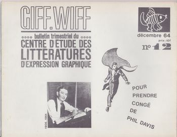 remarques: | édité par le CBD (club des BD), puis par CELEG (centre d'études des littératures d'expression graphique) série de 23 numéros de juillet 1962 à mars 1967, réalisé par une équipe de tout premier ordre dont Francis Lacassin, le Giff-Wiff est la première revue consacrée à l'étude de la bande dessinée à une époque où celle-ci n'était considérée qu'avec distance, la clarté et 'intelligence des articles font de cette revue un monument de la critique BD n.b. seuls deux numéros sont collectionnés ici à titre d'exemplaires représentatifs de la série numéro 12 de décembre 1964 - le franglais dans les bandes dessinées - prolégomènes à une étude de la bande "comique" - hommage à Phil Davis - entretien avec Lee Falk à propos du style de Phil Davis Information n.b. à noter que le Giff-Wiff est un petit animal curieux apparu dans les aventures de Pim, Pam, Poum; Giff-Wiff est un périodique d'étude et de réédition consacré à la bande dessinée, et principalement au comic strip américain de l'entre-deux-guerres, publié de juillet 1962 (n°1) à mars 1967 (n°23) et dirigé tout au long de son existence par Francis Lacassin ublié par le Club des bandes dessinées (devenu CELEG en novembre 1964), c'est la première revue consacrée à la bande dessinée du monde francophone. à partir du numéro 20 (mai 1966), l'éditeur spécialisé dans la contre-culture, Jean-Jacques Pauvert prend en charge sa publication, lui assurant une large diffusion. Giff-Wiff cesse de paraître lorsque le Celeg se dissout en 1967, le titre a connu diverses graphies (Giff ! Wiff !, Giff Wiff !) et a été suivi de différents sous-titres (bulletin du Club des bandes dessinées, bulletin du Centre d'études des littératures d'expression graphique, revue de la bande dessinée) hormis les deux premiers et le dernier numéros au format A4, Giff-Wiff a été publié dans un format à l'italienne (plus large que long) |