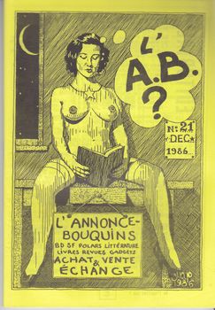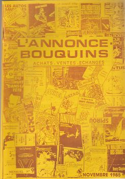remarques: | petit fascicule BD édité par Pierre Caillens, Libourne nos 5 à 33 (c'est la suite des grands format nos 1 à 4) intitulé Annonce-Bouquins s'occupant de ventes et échanges de bandes dessinées et autres revues variées: polar, science-fiction, etc en y ajoutant occasionnellement des entretiens avec les dessinateurs des d'articles divers sur la bande dessinée, critiques, côtes, etc contient des annonces farfelues telles que - petit suisse recherche contre edelweiss ou fée verte.... - descendant de Guillaume Tell vise encore recherches suivantes... - Asterixo helvetico sempre requisit bedeorum citate... - fouine forestière fédérale farfafouille fièvreusement.... - corbeau confédéré cède camembert classé contre.... - chevalier crispé continue croisade pour cahiers connotés... - collectionneur canni-bd cherche compléter cassecroute cité... - trafiquant bd tisse toujours toile toute trouvaille... |