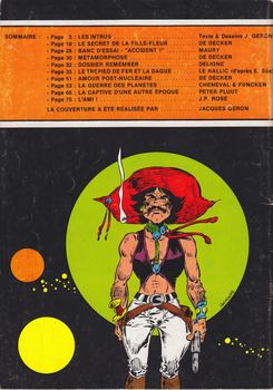 remarques: | numéro 21 dans la série Curiosity Magazine, Nouvelle Formule, couverture par Géron sommaire: - les intrus par Jacques Géron, du sexe préhistorique et scientifique - le secret de la fille-fleur par Decker - banc d'essai "accident" par Maury - métamorphose par Decker - dossier remember: hommage au journal Pic Nic début 1946 et qui finit au no 24 de janvier 1974 avec plusieurs extraits du périodique dessinés par Gire, Niezab, Brantonne, Giffey dont un épisode complet inédit et couleur par le Rallic: le trépied de fer et la dague d'après un roman de E. Sue *** - amour post-nucléaire par Decker - une série d'Heroic-Albums: la guerre des planètes avec Akkor par Cheneval et Funcken - la captive d'une autre époque par Peter Pluut - l'ami par J.P. Rose - un fascicule tout à fait honorable, surtout pour l'histoire complète par Le Rallic |