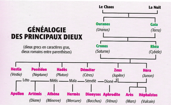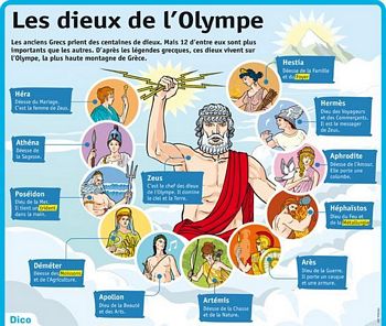 remarques: | mythologie grecque et romaine livre avec de nombreuses illustrations >> p. III Dieu n'est pas seulement l'être absolu, parfois tout-puissant souverainement généreux et bon, c'est aussi l'être extraordinaire monstrueux, prodige à la fois de force, de malveillance et de méchanceté - Rome s'est attribué la plupart des dieux grecs >> p. VI la mythologie reste un trésor d'idées séduisantes et de splendides tableaux Ière partie: les origines - d'abord vint le chaos, puis la nuit et l'Ebère = le jour - le destin était administré par les trois Parques et ne pouvait être commandé - Gaia (la terre), mère de tous les êtres épousa Uranus, dieu du ciel - Saturne (ou Cronos), leur fils épousa Rhéa de qui naquirent Jupiter, Neptune, Pluton et Junon - Saturne fut détrôné par Jupiter IIème partie: l'Olympe >> p. 18 le mont Olympe étant le plus élevé de la Grèce, c'est sur son sommet, parfois perdu dans les nuages, que les poètes placèrent le séjour de Jupiter et de la plupart des dieux - Jupiter (Zeus) règne sur l'Olympe, les Cyclopes lui donnèrent la foudre (le ciel), à Pluton un casque (Enfers) et à Neptune un trident (la mer) - les Titans qui avaient aidé Saturne à combattre furent précipités dans les profondeurs du Tartare sous la garde des Géants - Junon, soeur de Jupiter, fut la dernière de ses femmes - Junon (Hera) ne vivait pas en bonne intelligence avec Jupiter, les querelles étaient nombreuses, Junon persécuta toutes les concubines de Jupiter: Io, Europe, Sénélé, Platée, etc; elle donna naissance à Vulcain, Mars et Typhon, Junon est principalement représentée comme matrone majestueuse - Minerve (Pallas ou Athena) fille de Jupiter, déesse de la guerre, des sciences et des arts, n.b. se sentant un grand mal de tête, Jupiter eut recours à Vulcain qui, d'un coup de hache, lui fendit la tête, du cerveau de Jupiter sortit Minerve toute armée, elle donna son nom à Athènes dont elle fut la protectrice, on lui bâtit le temple de Parthénon, ses animaux consacrés étaient la chouette et de ldragon - Vesta (Hestia) déesse du feu sacré et du foyer de la maison, adorée à Troie, Enée apporta son culte en Italie où dans un temple était entretenu le feu sacré par les vestales - Apollon (Phébus) fils de Jupiter et de sa concubine Latone, n.b. Latone fils du Titan Coeus fut aimée par Jupiter mais Junon jalouse la fit persécuter par le serpent Python il était le frère jumeau de Diane, dieu du soleil et de la lumière, de la musique, de la poésie et des arts, on l'adorait principalement dans son temple: l'oracle de Delphes, il était représenté par le célèbre Colosse de Rhodes - Diane (Artémis) soeur jumelle d'Apollon, déesse des bois et de la chasse, elle était accompagnée de 60 nymphes, plusieurs surnoms: Phébé pour la lune, Hécate aux Enfers, déesse sans pitié, elle avait un temple à Ephèse - Cérès (Demeter) fille de Saturne, soeur de Jupiter, déesse de l'agriculture et des moissons, le mot céréales vient du nom de la déesse, les Eleusis = mystères de Cérès = fêtes religieuses, sa fille Proserpine fut enlevée par Pluton - Vulcain (Hephaestos) un dieu laid et difforme qui épousa Venus, déesse de l'amour, dieu du feu et des forgerons, il forgea les armes d'Achille, il habitait la Volcanie d'où vient le nom volcan - Mercure (Hermès) fils de Jupiter et de Maïa, fille d'Atlas, messager des dieux et en particulier de Jupiter, dieu de l'éloquence et des marchands, ambassadeur et dieu à tout faire, il traverse l'espace avec la rapidité de l'éclair - Mars (Arès = le brave) Bellone fut sa soeur et sa femme, c'est elle qui produisit Deimos (la terreur) et Phobos (la crainte), Mars était particulièrement honoré à Rome car il était accompagné de la victoire, bien qu'il n'était pas toujours invincible, il aurait été le père de Remus et Romulus - Venus (Aphrodite) la déesse Aphrodite, une des divinités les plus célèbres dans l'Antiquité, née de l'écume de mer (en grec aphros), déesse de la beauté et des plaisirs, elle fut la mère d'Eros et de Cupidon et fut donnée par Jupiter comme épouse à Vulcain, il existe de Venus plusieurs statues dont la Venus de Milo découverte en 1820 à Milo, l'une des îles Cyclades - Bacchus (Dionysos) fils de Jupiter et de Sémélé, princesse thébaine, Silène fut son père nourricier, devenu grand, Bacchus fit la conquête des Indes, dieu du vin qui délivre l'esprit, les Bacchantes étaient les nymphes que Bacchus emmenait souvent avec lui, elles participaient dans les orgies aux fêtes de Bacchus (bacchanales), à Athènes, ces fêtes étaient appelées les Dionysiaques - Themis fille d'Uranus, mère des heures et des parques (moires), déesse de la justice, de la loi et de l'équité, Thémis assiste Zeus dans l'Olympe de ses conseils - Cupidon ou l'Amour avec Eros et Anteros ainsi que son amour pour Psyché - Iris, la messagère des dieux, principalement d'Hera, tout comme Apollon était le messager de Jupiter, déesse de l'arc-en-ciel - Hébé, fille de Jupiter et de Junon, déesse personnifiant la jeunesse, la vitalité et la vigueur des jeunes, elle protège les jeunes mariés, son équivalent romain est Juventas, avant l'arrivée de Ganymède sur l'Olympe, elle sert d'échanson aux dieux, elle fut remplacée par Ganymède auprès de Jupiter suite à une malveillance - les Grâces ou Charites elles étaient trois déesses qui dispensaient aux hommes la bonne grâce, la libéralité et la bonne humeur, leurs noms: Aglaé, Euphrosyne et Thalie les Muses étaient au nombre de neuf, chaque muse représente et protège une forme d'art: - Clio = gloire, muse de l'histoire - Euterpe = qui sait plaire, muse de la musique - Thalia = fleurir, muse de la comédie - Melpomène = chanter, muse de la tragédie - Terpsichore = danser, muse de la poésie et de la danse - Erato = amour, muse du chant nuptial - Polymnie = parler, muse de la pantomime et de la 