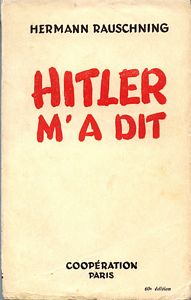 remarques: | Rauschning, ancien chef national-socialiste du gouvernement de Dantzig un livre super intéressant sur la psychologie et les buts d'Hitler dont les idées ne manquent pas d'originalité mais donnent un avant goût de l'apocalypse, une bible maléfique raconté avec brio par Rauschning qui ne mâche pas ses mots |