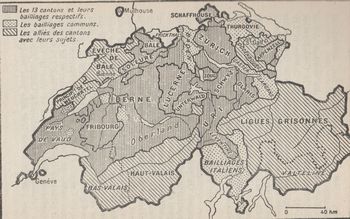remarques: | histoire de la Suisse PUF no 140 petit condensé d'histoire suisse 1/ les origines - l'Helvétie était colonie romaine jusqu'en 400 AC avec garnisons à Nyon et Windisch, Avenches en était le chef-lieu - 2 grandes voies traversaient alors le pays: a) via le Grand-Saint-Bernard vers la vallée du Rhône b) via le Splügen vers la vallée du Rhin - après la chute de l'empire romain, les Burgondes s'établissent à l'ouest et les Allamans à l'est - les Burgondes étaient convertis et les Allemans le furent par le missionaire Saint-Gall - vers 800, formation du royaume de Bourgogne et la région de Berne est gouvernée par les Zähringen, à la mort sans héritier de Berthold V Zähringen en 1218, les Habsbourg et la maison de Savoie se partagent les territoires des Zähringen - après 1218, les communautés centrales de Suisse (Uri, Schwyz et Unterwald) forment une alliance contre les Habsbourg en se référant à la lettre de franchise de l'autorité du Saint-Empire Germanique - Rudolf de Habsbourg, devenu empereur, continua de respecter cette charte, mais à sa mort leurs fils voulurent contrôler plus sévèrement les passages des Alpes qui donnaient de la richesse aux habitants - ce fut d'abord le pacte du Grütli ou Spire (en latin), alliance perpétuelle dans l'offensive comme dans la défensive, entre confédérés (Eidgenossen = hommes liés par serment) >> p. 15 détails du pacte 2/ la tradition - rebellion contre les baillis autrichiens par la conjuration de trois hommes: Werner Stauffacher de Schwyz, Walter Fürst d'Uri et Arnold du Melchtal de Unterwald - légende de Guillaume Tell 3/ la lutte contre les Habsburg, la confédération des huit cantons - les premiers cantons se gouvernent par la Landsgemeinde (assemblée générale), - après la victoire de Morgarten sur Leopold de Habsburg, conclusion du pacte de Brunnen (1315) en allemand - 1332 alliance avec Lucerne, 1352 avec Zurich, Zoug et Glaris et 1353 avec Berne = confédération des VIII cantons avec Bienne et Soleure comme alliés - nouvelles victoires contre les Habsburg à Sempach (1386) et Naefels (1388), c'est depuis ce moment que date la réputation militaire des suisses - expansion territoriale avec les baillages d'Argovie, de Baden et de Thurgovie >> p. 27 le tribunal suprême, origine de la Diète fédérale, pour une administrations commune afin d'éviter des politiques divergentes - suite à la politique d'expansion de la Bourgogne et manipulé par Louis XI, lutte des confédérés contre Charles le Téméraire (Grandson et Morat) 4/ la confédération des XIII cantons - l'intervention en 1481 de l'ermite Nicolas de Flüh pour aplanir les différences entre cantons (sans les aplanir complètement) - 1499 guerre de Souabe, nom donné par ce qu'elle opposa aux suisses, outre l'empereur du Saint-Empire la ligue de Souabe, fondée quelques années auparavant par les princes et villes du sud de l'Allemagne, elle se déroula autour de Bâle et le long du Rhin, en Thurgovie et dans le Vorarlberg - 1511 entrée de Fribourg, Soleure, Bâle, Schaffhouse ainsi que en 1513 d'Appenzell, ce qui deviendra la Suisse des XIII cantons - guerre d'Italie pour la possession du Milanais lors de laquelle les mercenaires se battaient parfois dans les camps adverses >> p. 36 les suisses appelés les Kronenfresser (avaleurs de couronnes = écus d'or) - victoire à Novare en 1513, mais défaite à Marignan en 1515 où François Ier ne rencontra en fait que la moitié des suisses, les cantons occidentaux ayant fait la paix avec la France et grâce à de fortes indemnités, le roi de France fit alliance avec les cantons en concluant une paix perpétuelle avec la France - mais ce ne fut pas la défaite de Marignan qui mit fin au rôle politique et militaire des suisses, ce furent les discordes engendrées par la Réforme 5/ la Réforme en Suisse - suite à la doctrine de Lüther, Ulrich Zwingli commence ses prédications à Zurich en 1521 et la Réforme se développe surtout dans les villes, ce qui créa un fossé au sein de la Confédération - 1531 mort de Zwingli à la 2ème bataille de Kappel - Berne, cité évangélique, étend sa domination sur la Suisse occidentale - en 1526 Farel et Calvin impose la Réforme à Genève qui passe sous le protectorat de Berne entrant en conflit contre le duc de Savoie - 1536 conquête du pays de Vaud par les bernois - dès la guerre de Trente Ans, naquit la tradition de neutralité des suisses, ceux-ci ne voulant s'engager dans les conflits d'aucun parti 6/ XVII et XVIIIème siècles - période de prospérité pour la Suisse, développement de l'industrie, la production agricole suffisait à la population, l'oligarchie triomphe, la Landsgemeinde est le pouvoir souverain, dans les villes les corporations de métier détenaient principalement le pouvoir avec le patriarcat (bourgeoisie, Bürger) 7/ la Confédération à la veille de la Révolution - en plus des XIII cantons, leurs alliés: St-Gall, le Valais, les trois ligues des Grisons, Mulhouse, la principauté de Neuchâtel (propriété du roi de Prusse dès 1707 et la ville de Genève ainsi que les bailliages tel le Tessin qui appartient à tous les cantons, en bref le Confédération était devenue un édifice complexe 8/ la révolution helvétique - la révolution française influença beaucoup la Suisse, surtout dans le pays de Vaud soumis à Berne - occupation par les forces françaises de l'Evêché de Bâle, annexion de Genève et sous le directoire, Bonaparte enlève la Valteline aux Grisons ainsi que le Bas Valais, ceci pour s'assurer les voies de communication alpines, la neutralité suisse devenait sans grand intérêt pour la France - le club helvétique à Paris dirigé par le vaudois Laharpe ainsi que le bâlois Pierre Ochs demandèrent l'intervention de la France dans l'ancien régime suisse - 1798 début de l'occupation française, d'abord envers les Bernois et le Jura, puis la Suisse centrale où la République helv