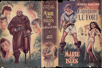 remarques: | le troisième volet de la série Marie des Isles, gros volume de 700 pages édition 1951 avec jaquette en excellent état fin de la trilogie sur les aventures de Marie des Isles qui meurt à 44 ans après que le capitaine Le Fort ait rétabli l'ordre en Martinique et fait sa propre justice >> p. 245 Le Fort qui sert farouchement ses poings énormes (y inclus son moignon?) >> p. 249 description exacte d'une prothèse (en l'occurence du crochet de Le Fort): une étreinte pas trop forte, car elle eût empêché le sang de circuler et non plus pas trop molle de manière qu'elle pût résister à de gros efforts >> p. 356 les larmes montaient aux yeux (d'un borgne?) >> p. 397 avant de manger le jambon, on fait sauter les vers qui le recouvrent avec la pointe d'un couteau >> p. 608 la prothèse de jambe du père Fauvel en forme de bouteille de bois terminologie - hydropique = souffrant de rétention ou d'un épanchement totalement inhabituel de liquide organique - ansepessade = grade de l'infanterie française au XVIème siècle - aduste = se dit de quelque chose de brûlé ou desséché (sang) - vénusté = grâce, beauté digne de Vénus - aumusse = vêtement ecclésiastique, utilisé dans la liturgie catholique - escoriation = perte des couches superficielles de l'épiderme - épissoire = outil de marine servant à écarter les torons d'un cordage - toron = ensemble de cordage - battre la coulpe = se frapper la poitrine, en répétant mea culpa - ingambe = qui a un usage normal de ses jambes >> un livre sans grande prétention littéraire, du même genre que les deux précédents volumes mais toujours assez passionnant avec de bonnes aventures et une bonne description des flibustiers et de la vie aux Antilles dans les îles de la Martinique, Marie-Galante et Saint-Christophe, cette dernière encore partagée entre français et anglais |