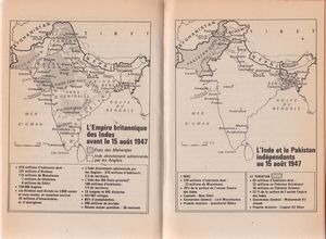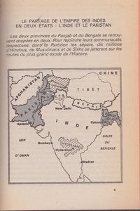remarques: | cette nuit, la liberté le récit de l'indépendance des Indes livre dédicacé par Lapierre documentation >> dossier 730A 1/ un empire romantique au 1.1.1947, bien que pauvres, les anglais sont encore riches, ils possèdent le passeport britannique (bleu et or) leur donnant le privilège de pénétrer librement sur plus de territoires qu'aucun autre citoyen d'aucun autre pays du monde 50 millions d'anglais (dont 2-3 millions aux Indes avec une armée avant 1914 d'environ 600'000 hommes) règnent alors sur 563 millions d'hommes répartis sur 291 territoires (chinois, hottentots, mélanésiens, australiens, canadiens, hindous, gurkhas du Népal, sikhs du Penjab, pathans de la frontière afghane, swahilis du Kenia, soudanais, malaisiens, jamaicains, chasseurs de têtes de Borneo, housas de la Côte d'Or, etc) c'était l'empire britannique constitué de protectorats, condominiums et colonies où règnait la Pax Britannica et en 1858 début de l'ère victorienne avec l'Union Jack comme drapeau n.b. Un condominium est, en droit international public, un territoire sur lequel plusieurs États souverains exercent une souveraineté conjointe au terme d'un accord formel les seuls territoires terrestres historiquement connus sous cette dénomination sont le condominium anglo-égyptien sur le Soudan (1899-1956) et le condominium des Nouvelles-Hébrides (1906-1980) en 1947, Clement Attlee et le partie travailliste sont au pouvoir sir Louis Francis Albert Victor Nicholas Mountbatten, cousin du roi, est sollicité comme dernier vice-roi des Indes (en remplacement de sir Archibald Wawell) avec les pleins pouvoirs pour organiser le retrait de l'Angleterre des Indes population: 300 mio d'hindous et 100 mio de musulmans sahib = maître blanc, memsahib = anglaise habitant les Indes le 31.12.1599 l'empire britannique avait débuté avec la création de la East India Trading et William Hawkins, capitaine du navire "Hektor" fut le premier à mettre le pied sur le continent indien le 24.8.1600 et en 1757 l'Angleterre donnait le coup d'envoi à la conquête des Indes (après avoir éliminé leurs concurrent français dirigés par l'amiral Dupleix) ce teritoire deviendrait le joyau de la couronne britannique >> p. description de l'Inde coloniale les anglais règnaient sur les Indes mais les anglais vivaient à part avec leur sport et leur étiquette sociale bien à eux, c'était la race que Dieu avait choisi pour gouverner et soumettre et ce fut aussi le dernier empire romantique 2/ 400 millions de fous de dieu un petit homme de 77 ans avait toutefois influencé depuis 30 ans le cours des évènements avec comme doctrine "l'ahimsa" (la non violence), presque un deuxième Jésus Christ! l'Inde mystique avait reconnu dans ce frêle petit homme à la lumière de ses actes, le génie d'un "mahatma" (une grande âme) et l'avait suivi Gandhi possédait l'art des gestes simples qui parlent à l'âme de l'Inde et il mettait l'Angleterre à genoux en buvant de l'eau et du bicarbonate de soude il exercait son pouvoir depuis Srirampur dans le district isolé à majorité musulmane de Noa-Khali (près de Calcutta) ses 4 disciples dont Manu, sa fidèle petite-nièce, l'accompagnait partout avec la figurine d'ivoire dont Gandhi ne se séparait jamais et qui sous la forme de 3 singes les mains sur les oreilles, les yeux et la bouche représentaient les 3 secrets de la sagesse "n'écoute pas le mal, ne vois pas le mal, ne dis pas le mal" Gandhi était le fils d'un diwan (genre de premier ministre) de Rajkot = petite principauté au nord de Bombay les deux religions principales des Indes: 1/ l'Islam qui se base sur un seul dieu (allah) et son prophète (Mahomet) avec le coran comme bible 2/ l'Hindouisme est une religion sans fondateur et sans dogme, le créateur et la création ne font qu'un sous les aspects les plus variés (hommes, animaux, plantes) une seule faute (ou péché?): l'avidja (l'ignorance) avec une multitude de dieux dont les principaux: Brahma le créateur, Civa le destructeur, Vishnu le préservateur mais selon les écrits védiques, ce qui séparait surtout les deux religions, c'était la grande barrière du système des castes chez les hindoux: a) les brahmanes = les prêtres = la caste la plus haute b) les kshatriyas = les guerriers c) les saiçyas = les commerçants d) les çudras = les artisans e) les intouchables = les sans-caste le bilan du bien et du mal s'appelle le "karma" et pour l'hindouisme, il y a aussi la vénération de la vache = les vaches sacrées (dont dépendait la survie du peuple dans les anciens temps) en 1947 il y en avait 200 mio de têtes soit 1 vache pour 2 indiens et aussi les hindoux croyaient à la réincarnation il y avait aussi deux droits différents: le droit hindou et le droit musulman mais il y avait surtout l'inégalité économique et sous les anglais, ce furent les hindous qui firent fonctionner les rouages de la machine administrative: Imperial ou Indian Civil Service (financiers et hommes d'affaires) alors que les musulmans représentaient surtout les paysans et les artisans et alors que les intouchables, les parias, étaient méprisés par les hindous, la religion musulmane les attirait favorablement dans son sein comme convertis le 16.8.1946 des émeutes raciales à Calcutta servirent de catalyseur à la haine entre hindoux et musulmans d'où le projet d'un état musulman mentionné dès 1933 pour ne pas être dominé par les hindoux; selon son auteur Rahmat Ali, il devrait être formé par le Penjab, le Cachemire, le Sind, le Baluchistan et un territoire du nord-ouest le nom proposé pour ce nouvel était était le Pakistan = pays des purs en 1947, Mohammed Ali Jinnah avait pris la tête de ce mouvement il y avait encore aux Indes une troisième religion: les Parsis, minorité issue des zoroastriens, les adorateurs du feu de la Perse antique ainsi que la secte des "thugs" = étrangleurs, adorateurs de Kali la déesse de la destruction 3/ les chemins de la 
