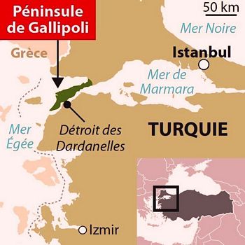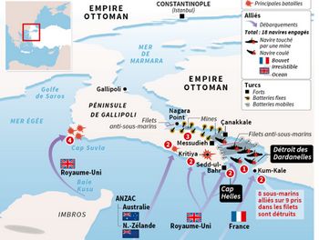 remarques: | Dardanelles (titre anglais Gallipoli, 1956) l'entreprise amphibie du débarquement sur la presqu'île turque des Dardanelles en 1915 petites traces de scotch sur la jaquette, intérieur en parfait état nomenclature - superfétatoire = qui s'ajoute inutilement (à une chose utile) - palinodie = changement d'opinion - embobeliner = duper, séduire - improuver = ne pas approuver, blâmer - août 1914, la Turquie affaiblie, on pensait qu'elle allait rester durant la guerre, néanmoins elle recherchait une alliance et comme l'Angleterre l'avait quelque peu éconduit, elle se tourna vers l'Allemagne >> p. 12 description du comité union et progrès des Jeunes Turcs qui gouvernait alors la Turquie (dont Enver Pacha, Talaat Bey et Mustapha Kemal) après avoir chassé le sultan Abdul >> p. 16 description et fonction des ambassadeurs à Istambul (qui est encore appelée Constantinople par l'auteur) - l'ambassadeur allemand Wangenheim avec le chef de la mission allemande, Liman von Sanders, réussirent à convaincre le nouveau comité de faire alliance avec l'empire allemand (début 1914) - deux navires de guerre devaient être livrés à la Turquie, mais au début de la guerre, Churchill stoppa cette livraison et pour les turcs humiliés, ce fut le prétexte à l'alliance avec les allemands, qui en outre leur promirent de remplacer ces deux navires par les croiseurs de bataille Goeben et Breslau >> p. 23 le calembour en vigueur: Deutschland über Allah - les plus exposées étaient les russes dont le trafic maritime devait passer par le Bosphore - la Turquie ferme les détroits le 30.10.1914 et la guerre est déclarée à la Turquie par les alliés - début 1915, une manoeuvre de détournement contre le Reich est envisagée dans les Balkans n.b. le détroit des Dardanelles est un long passage maritime de près de 90 km situé entre la presqu’île de Gallipoli et la côte d’Asie et reliant la mer Egée à la mer de Marmara continué par le Bosphore d'une longueur de 30 km - les détroits avaient été fortement renforcés lors de la guerre italo-turque de 1912 - et en février 1915, c'est une opération navale qui se forme pour forcer les Dardanelles et s'emparer de Constantinople >> p. 35 les membres du conseil britannique de la guerre, Kitchener dominait les délibérations et on ne pouvait guère le contrecarrer >> p. 38 description du comité de guerre et de l'amirauté: Asquith premier ministre, Churchill premier lord de l'amirauté, Kitchener chef de l'armée, Fisher lord de la mer, Lloyd George chancelier de l'Echiquier, sir Edward Grey aux affaires étrangères - le reproche fait à Churchill fut d'avoir embobeliné les amiraux, surtout Fisher qui à l'origine était contre l'opération navale des Dardanelles (appelées aussi Hellespont) - début de l'opération 19 février 1915, mais le 18 mars rien n'avait été obtenu malgré une offensive importante contre le goulet de Tchanak (large de 4 km et long de 8 km) - si la flotte alliée arrivait à franchir le goulet, tout était perdu pour les turcs - tout commença favorablement pour la flotte alliée qui progressait selon le plan d'attaque, mais le déminage ne put pas être complètement effectué, détruisant trois navires de guerre et le danger des mines non écarté, la flotte dut se replier - pourtant les turcs étaient non préparés contre une offensive de la flotte et tout le monde pensait que la flotte alliée arriverait sans problème devant Constantinople, la cité se vidait déjà - le repli de la flotte alliée fut une surprise car les troupes et l'artillerie turques étaient désorganisées eet manquaient maintenant de munition - les alliés décidèrent alors qu'il fallait une armée terrestre pour appuyer l'action de leur flotte, à cet effet Kitchener leva une troupe de 70'000 hommes, composée principalement de la ANZAC (Australia New Zealand Army Corps), mais l'opération prit du retard et organisée sans grande planification - la date de l'offensive fut alors fixée au 14 avril - le 18 mars pour les turcs fut une victoire sur la puissante flotte britannique et elle renforca leur volonté de résister - la fureur turque se déclancha contre les arméniens qui furent considérés comme boucs émissaires >> p. 83 le génocide arménien comme décrit par Henry Morgenthau, ambassadeur américain - fin mars 1915, le commandement de toutes les troupes turques aux Dardanelles fut confié à Liman von Danders, celui-ci mit alors tout en oeuvre pour consolider la défense de la presqu'île de Gallipoli et surtout l'offensive alliée n'allait plus du tout les surprendre, car les services de renseignement était au courant de tous les préparatifs alliés pour le débarquement, de plus les turcs bénéficiairent d'une répit de cinq semaines avant le début des opérations alliées >> p. 91 du côté allié, l'expédition de Constantinople éveilla une véritable fièvre parmi les jeunes gens d'Angleterre, un mystérieux désir de guerre soufflait sur les hommes qui composent un peuple >> p. 94 description de Ian Hamilton, général chargé par Kitchener de commander l'expédition terrestre >> p. 100-102 un débarquement effectué sans surprise et sans grande planification, quelques reconnaissances aériennes eurent toutefois lieu et le spectacle du débarquement pouvait presque être assimilé à des régates - le débarquement s'effectua le 25 avril au matin, le point principal de l'opération était de s'emparer des hauteurs, celui qui contrôlait les hauteurs dominait la situation et ce fut Mustapha Kemal qui peut-on le dire fut à la hauteur des évènements en jetant ses bataillons et repoussant les anglais des hauteurs de Tchounouk Bair >> p. 119 l'assaut sur Seddul-Bahr ou cap Helles échoua complètement, à Tekke Bournou le débarquement eut un peu plus de succès, ces forces auraient pu alors contourner les lignes turques, mais sans ordre précis, les troupes restèrent sur place et sans autre coordinat