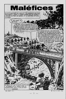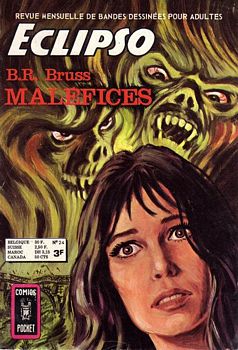remarques: | maléfices, no 18 - 1954, un petit bourg dans les Pyrénées où on inaugure un pont qui cause continuellement plusieurs accidents et la série continue, on l'appelle le pont maudit - pour découvrir le maléfice, il faut retourner en arrière dans une famille française >> p. 45 la partie de chasse bizarre avec un sanglier qui d'abord blessé disparait sans laisser de traces et des chiens qui semblent voler >> p. 107 le mystère des empreintes de chien sur le plafond d'une chambre et mention d'un monstre qui hantait la région au XVIème siècle >> p. 116 les chiens qui montent aux arbres >> p. 135 le piano qui joue tout seul la danse macabre - les explications du braconnier Horola: la force mystérieuse qui provient de l'ancienne Egypte et le braconnier serait le 52ème pharaon qui de génération en génération recherche un bijou disparu afin de conjurer les forces du mal >> p. 215 la mort du 52ème pharaon Horola qui se sacrifie pour éteindre les forces du mal - les raisons du pont maudit: les talismans du mal ont été fondus dans des hauts-fourneaux qui ont fabriqué l'acier pour construire le pont maudit, les forces maléfiques seront détruites par la fille du 52ème pharaon ce qui causera la destruction du pont >> une angoisse dont les maléfices tirent en longueur, assez bien raconté, mais rien de très terrifiant ni distrayant annexes - couverture du livre - couverture Eclipso/Aredit no 24 (1972) - extrait de page |