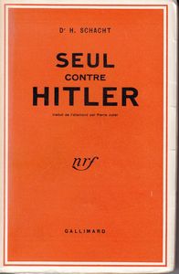 remarques: | les carnets de note du dr. Schacht qui se croit le seul à avoir pu tenir tête à Hitler, ce qui est d'ailleurs juste en partie, mais il n'était pas le seul n.b. mauvaise traduction en français du titre "seul contre Hitler" qui ne correspond pas au titre allemand "Abrechnung mit Hitler" (= règlement de compte avec Hitler) >> le livre est assez intéressant, surtout pour les chapitres 4 à 12 parlant de la résistance intérieure allemande, des coups d'état manqués, l'arrestation de Schacht à la fin de la guerre, son accusation, son jugement au procès de Nuremberg et une dissertation sur Hitler, le grand coupable ainsi que du problème allemand (les raisons des deux guerres mondiales) |