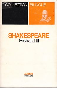 remarques: | livre bilingue édité avec version originale anglaise et traduction sur la même page, version originale tirée probablement par Shakespeare en grande partie du livre de Thomas More (1453) "the history of king Richard III" >> pièce dramatique mais aussi teinté d'humour, Churchill en aurait fait une analyse dans les années 50, à comparer: la pièce et le film de Laurence Olivier (1955) qui reste assez fidèle à la pièce livre intéressant et on peut aussi se référer à la version anglaise pour la comparaison et la compréhension |