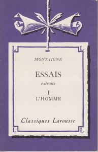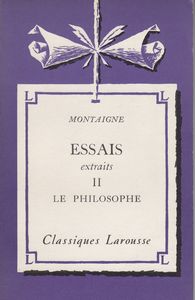 remarques: | essais (extraits) tome 1 l'homme tome 2 le philosophe Michel Eyquem de Montaigne, dit Montaigne, seigneur de Montaigne, né le 28 février 1533 et mort le 13 septembre 1592 à Saint-Michel-de-Montaigne (Dordogne), est un philosophe et moraliste de la Renaissance, il a pris une part active à la vie politique, (comme maire de Bordeaux et comme négociateur entre les partis), alors en guerre dans le royaume (voir Guerres de religion (France)) les Essais (1572-1592) ont nourri la réflexion des plus grands auteurs en France et en Europe, de Shakespeare à Pascal et Descartes, de Nietzsche et Proust à Heidegger. |