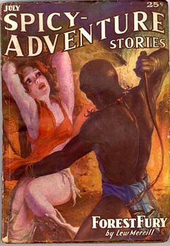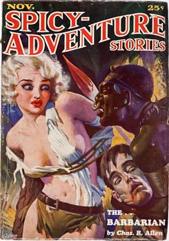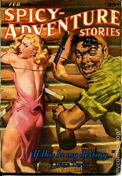 remarques: | NEO no 114, Wild Bill Clanton couverture de Nicollet un livre de huit nouvelles dont six avec Wild Bill Clanton, l'aventurier des mers du sud très musclé et aux poings d'acier 1/ le démon des mers du sud (the she devil) - premier épisode avec Wild Bill Clanton et Bully Harrigan, le capitaine du Saucy Wench (= femme impudente ou effrontée) 2/ mutinerie à bord (ship in mutiny) - Clanton prend le commandement du Saucy Wench 3/ le coeur pourpre d'Erlik (the purple heart of Erlik) >> p. 63 le système de miroir qui fait admirer les dessous d'une femme quand elle marche 4/ le dragon de Kao Tsu (the dragon of Kao Tsu) 5/ le grog du meurtrier (murderer's grog) = the bhang = cocktail qui rend furieux avec Sonya Ormanoff, l'unique femme blanche de Peshawar 6/ le sang du désert (desert blood) - Clanton qui deviendrait chasseur de lions 7/ les canons de Khartoum (guns of Khartoum) avec un nouveau héros: Emmett Corcoran qui remplace Wild Bill Clanton et qui part à la rescousse de Ruth Brenton enlevée par le Mahdi 8/ les filles de la haine (daughters of feud) - l'école de Whiskey Run et son instituteur qui distribue des fessées mémorables >> le début était prometteur, sang, sexe et violence avec beaucoup de mâchoires fracturées par Clanton, et des nouvelles assez bien racontées par Howard, mais les deux derniers épisodes sont de moindre intérêt nomenclature - suriner = frapper, tuer à coups de couteau - liniment = mélange d'eau de chaux et d'huile d'olive employé contre les brûlures cutanées - Afridi = nom de famille pakistanais Information Pour ce nouveau personnage de Howard dans cette série, l'aventure et le sexe sont au rendez-vous, des courts récits parus initialement dans le magazine Spicy Adventure Stories avec des couvertures très osées pour l'époque annexes - couverture du livre - couvertures de Spicy Adventure Stories |