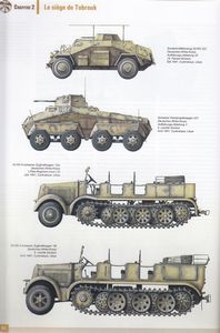 remarques: | prologue l'incroyable épopée de l'Afrika Korps est un des mythes de la seconde guerre mondiale liée à la personnalité de Rommel, les raisons des succès de Rommel: la qualité combative des unités allemandes et l'incapacité des généraux anglais à organiser des contre-attaques efficaces petit récapitulatif de la première campagne: 1) le temps de la reconquête heia safari mars/avril 1941 débarquement en février 41 d'une première force allemande avec les divisions motorisées italiennes Ariete et Trieste, de leur côté les forces alliées en Afrique sont incomplètes (en partie envoyées en Grèce) le 24.3. prise d'Agheila par Rommel >> p. 19 le confort des chars italiens M 13/40 le 6.4. retraite générale des anglais vers la frontière égyptienne, mais Tobrouk restera une position fortifiée le 9.4. les premiers éléments allemands arrivent devant Tobrouk, mais arrivés trop tard pour surprendre les défenseurs, ils sont trop faibles pour mener un assaut important, néanmoins Rommel continue vers la frontière et y occupe des positions stratégiques dont la passe d'Halfaya 1A) considération sur l'offensive de Rommel, l'intervention de Rommel est sollicitée par Mussolini, car l'armée italienne manque de matériels modernes et l'arrivée de l'Afrika Korps annonce de facto la fin de l'autonomie militaire italienne, Rommel fut un bon choix sauf pour ses relations parfois difficiles avec le commandement italien l'envoi de l'Afrika Korps est toutefois marqué par l'improvisation, notamment pour la logistique et l'offensive de Rommel sera une partie de domino dont Rommel sut profiter suite à la faiblesse des forces anglaises, malgré que Wavell annule tout nouveau envoi vers la Grèce dès le début de l'offensive de Rommel (on n'ose imaginer les conséquences si Rommel avait attaqué un mois plus tard alors que la plupart des troupes anglaises auraient été engagées en Grèce) 2) le siège de Tobrouk avril/novembre 1941 les australiens de Moreshead résistent brillamment aux assauts de Rommel, la garnison est aussi continuellement soutenue par des convois maritimes anglais fin avril Rommel lance un assaut sur le saillant de Ras el Medauuar au sud-ouest >> p. 55 des Flammpanzer sont même engagés la crête de Ras el Medauuar restera aux mains des allemands (les italiens se battirent aussi farouchement), mais les défenses de Tobrouk ne pourront pas être percées le 10.5. operation "Brevity" pour dégager Tobrouk et contre-opération "Skorpion", les anglais doivent se replier suite aux renforts reçus par le convoi Tiger avec 238 chars, Wavell lance l'opération Battleaxe le 15.6. qui échoue à nouveau, Wavell est remplacé par Auchinleck, Crüwell devient chef de l'Afrika Korps >> p. 75à79 les dispositions de défense allemandes sur la frontière égyptienne (Stützpunkte) dont les 3 plus importantes: Sidi Omar, Halfaya-Sollum et Bardia vu la grande chaleur, le front reste relativement calme en été 41, Rommel lance l'opération Sommernachtstraum mi-septembre pour s'emparer de dépôts anglais, opération qui ne sera pas couronnée de succès >> p. 77 les enseignements de la guerre du désert 1) tactique du Flächenmarsch par les panzer = ouvrir le feu tout en se déplaçant 2) coopération interarmes, surtout entre panzer et artillerie antichar 3) l'avantage du canon 88 mm = allonge de tir avec capacité de percer le blindage de tous les chars anglais à 2 km 4) la logistique reste un problème important, il faut surtout a) protéger les convois harcelés par les "jock columns" du long range desert group b) organiser les camions de ravitaillement surtout en carburant qui doivent serrer de près les formations de panzer c) constituer des stocks à l'arrière 5) résoudre le problème de l'eau potable et des maladies causée par les mouches et la nourriture inadaptée 6) le sable est la cause principale de la détérioration des véhicules et la seule route vraiment carossable reste la via Balbia, les ateliers de réparation travaillent jour et nuit >> considérations sur le siège de Tobrouk a) l'attaque brusquée sur Tobrouk par Rommel n'était pas mal calculée en voulant profiter de la désorganisation de l'armée anglaise, mais celle-ci a gagné de vitesse l'Afrika Korps notamment les australiens qui réussirent à rejoindre Tobrouk et à fortifier les défenses b) l'avance sur l'Egypte devait impérativement passer par la prise de Tobrouk (et aussi celle de Malte), c)le point d'attaque sur Ras-el-Medauuar fut mal choisi (il aurait fallu plutôt attaquer au sud-est que au sud-ouest) d) opération Crusader novembre/décembre 1941 alors que l'assaut général sur Tobrouk est prévu pour fin novembre, l'opération Crusader déclanchée le 18.11. surprend Rommel, pour attaquer Rommel, Auchinleck a fait installer secrètement 4 dépôts de carburant à l'ouest de Maddalena pour avoir un coup d'avance, il prévoit un contournement des forces allemandes par le sud, puis remonter vers le nord-ouest, premier combat à Bir el Gobi entre 160 chars anglais, mais la division Ariete résiste, par contre au nord l'aérodrome de Sidi Rezegh tombe aux mains des anglais, les futurs combats se dérouleront principalement dans les zones de Sidi Rezegh et de el Adem le 23.11. bataille du Totensonntag, à la mi-journée, c'est une gigantesque concentration de blindés et de véhicules divers, les panzers emporteront la décision mais avec de lourdes pertes, c'est une victoire à la Pyrrhus, toutefois les anglais ont aussi subi de fortes pertes et connaissent des problèmes de ravitaillement car ils n'ont pas pu s'emparer du point stratégique de Halfaya. le 24.11. Rommel veut lancer une opération vers l'est pour dégager ses points d'appui, Crüwell préférerait élargir l'avantage sur les forces anglaises au sud de Tobrouk, Cunningham veut retirer ses forces mais Auchinleck lui amène de nouveaux renforts et l'oblige à continuer l'offensive, à l'est Rommel perd le c