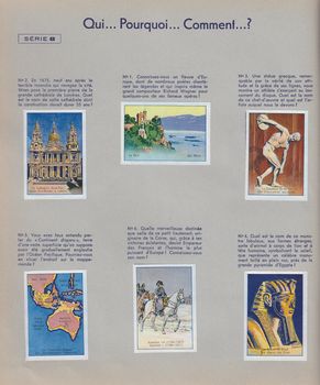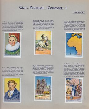 remarques: | Qui... pourquoi... comment.... album 1 NPCK 1940; 12 séries de 12 images = 144 images collées bien complètes n.b. il existe aussi un album no 2 non collectionné ici ce volume contient 8 séries de diverses questions sur l'histoire, les sciences, la géographie, les personnes, etc dont la solution est révélée dans le bas du timbre collé |