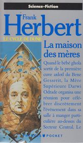 remarques: | la maison des mères (chapterhouse: Dune) - la maison des mères se termine par un cliffhanger et la mort subséquente d'Herbert en 1986 laissa certaines intrigues globales de la série non résolues - deux décennies plus tard, le fils de Herbert, Brian Herbert, avec Kevin J. Anderson, publie deux suites: a) les chasseurs de Dune (2006) et le triomphe de Dune (2007) basées en partie sur les notes laissées par Frank Herbert pour ce qu'il appelait Dune 7, son propre septième roman de la série du cycle de Dune n.b. cliffhanger = 1/adventure serial or melodrama espc. one presented in installments each ending in suspense 2/ contest whose outcome is in doubt up to the very end broadly = a suspenseful situation au sens littéral = suspendu à une falaise ou dans un roman, un genre de fin ouverte, laissée en suspens, afin de créer une forte attente résumé - le Bene Gesserit fait face à la destruction, les Honorées Matriarches, revenues de la Grande Dispersion, menacent en effet d’annihiler l'ordre des Révérendes Mères dans une lutte sanguinaire; déjà, les Matriarches ont réduit à néant le Bene Tleilax, pulvérisant ses planètes centrales et exterminant sa population, mais, il s’avère que ces furies semblent fuir elles-mêmes une menace, issue elle-aussi de la Dispersion, comme le montre l'apparition des futars, des créatures mi-hommes mi-félins qui semblent avoir été créés dans un seul but: tuer les Honorées Matriarches en les paralysant de leur cri, mais qui n’obéissent qu’à leurs mystérieux maîtres, les belluaires; - le Bene Gesserit, dirigé par la Mère supérieure Darwi Odrade, joue ses derniers atouts, le projet de transformation de la planète du Chapitre en nouvelle Dune se poursuit, afin de relancer la production de l’épice, par ailleurs, Odrade espère que son ghola (clone) du légendaire Bashar suprême Miles Teg dont elle a pu récupérer quelques cellules peu avant sa mort (dans le roman précédent), pourra les aider à vaincre les Matriarches, elle charge le ghola Duncan Idaho (le dernier ghola élevé sur Gammu, qui a récupéré ses souvenir originaux grâce à Teg dans le roman précédent) de réveiller ses souvenirs originaux - cependant Scytale, le dernier Maître Tleilaxu, sauvé in extremis par le Bene Gesserit et prisonnier dans un non-vaisseau indétectable sur la planète du Chapitre, reste le seul à posséder la connaissance pour produire artificiellement l’épice avec les cuves Axlotl, mais refuse de dévoiler son secret - il possède aussi, dissimulé dans sa poitrine, une capsule anentropique qui recèle des cellules prêtes à régénérer des Danseurs-Visage de la nouvelle génération ainsi que tous les principaux héros de la saga (dont Paul Atréides ou dame Jessica) - espérant monnayer ses connaissances auprès des Sœurs, son pouvoir de négociation est cependant diminué lorsque la Révérende Mère Sheana découvre le premier ver des sables né sur la planète du Chapitre, rejeton du dernier ver qui existait dans l'univers (sauvé de la destruction de Rakis par Teg peu avant sa mort dans le roman précédent) - la Révérende Mère Lucille, en mission sur Lampadas, réussit à quitter la planète-école du Bene Gesserit menacée de destruction avec son fardeau des mémoires secondes de ses Sœurs, mais est capturée après s'être posée sur Gammu, à la suite de l'avarie de son vaisseau - interrogée par la très Honorée Matriarche Dama, elle tente de trouver une échappatoire à son incarcération, sentant le manque de mélange s'installer dans son organisme - mais, à la suite de différences fondamentales entre leurs deux philosophies, et après avoir tenté le diable, Lucille est tuée par Dama alors que cette dernière pensait lui proposer de rejoindre son ordre - cependant, Lucille n'aura pas totalement échoué, ayant pu auparavant partager son fardeau avec Rebecca, une Révérende Mère sauvage juive de l’Israël secret, qu'elle rencontra sur Gammu - à la suite de la chute de Lampadas, une attaque menée par le ghola de Miles Teg est lancée contre les Honorées Matriarches sur Gammu, puis sur Jonction, l’attaque semble être une franche victoire pour les forces du Bene Gesserit, guidé par le ghola du rusé Bashar-Mentat revenu d'entre les morts, mais l'utilisation de l’arme par les Honorées Matriarches renverse le cours des évènements, anéantissant la force d'attaque Bene Gesserit - l’attaque de Jonction se termine sur un coup de dé de la part du Bene Gesserit: l'Honorée Matriarche Murbella, ayant suivi l'enseignement Bene Gesserit depuis sa capture sur Gammu par Lucille (dans le roman précédent), atterrit sur Jonction et fait croire à ses anciennes sœurs qu’elle s’est échappée, pour leur ramener les tant convoitées connaissances Bene Gesserit, toutefois, grâce à cet entraînement, Murbella est devenue plus qu’une simple Matriarche, ainsi, elle assure son contrôle sur ses anciennes sœurs en démontrant la supériorité de son héritage mixte, éliminant celles qui s'opposent à elle, finalement, elle initie une alliance forcée, accédant, après la mort de Darwi Odrade et l’élimination de Logno (la Matriarche qui a succédé à Dama et fait tuer Odrade) au rang de très Honorée Matriarche, en plus de devenir la nouvelle Mère supérieure du Bene Gesserit - à la fin du roman, Duncan Idaho s’échappe de la planète du Chapitre vers l’inconnu à bord du non-vaisseau où il était retenu prisonnier (car il ne possède pas les gènes qui pourraient le protéger des recherches prescientes), il emporte avec lui une petite colonie qui paraît destinée à fonder un nouveau monde, notamment: - Sheana (son alliée secrète, qui espérait comme lui échapper à l’emprise des Sœurs), - une Révérende-Mère qui possède les gènes de Siona Atréides qui la rendent indétectable aux prescients - Scytale, le dernier maître du Bene Tleilax mais aussi l'un 