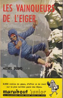 remarques: | collection Marabout Junior, no 111 l'ascension de la paroi nord de l'Eiger par Hugo, un jeune suisse avec Freddy, un guide autrichien en cours d'ascension, ils seront rejoints par une cordée allemande et une autre franco-belge; après une lutte sauvage sur le mur de la mort, Hugo et Freddy seront les seuls à atteindre le sommet, la cordée franco-belge dont l'un est blessé sera secourue par une caravane de sauvetage, mais on n'entendra plus parler de la cordée allemande >> p. 72 en montagne, il ne vaut mieux pas manger de sardines (risque de coliques ?) et l'Eiger ne reste pas plus de 3 à 4 jours sans nuage >> seule la dernière partie du livre est vraiment intéressante information sur l'Eiger il s'élève à 3974 m et il ne lui manque donc que 26 m pour faire partie au groupe des 4000 tel le mont blanc, le cervin, la Jungfrau, le Mönch, le Finsteraarhorn et le Schreckhorn la paroi proprement dite a 1600 m et l'escalader est l'une des plus périlleuses ascensions que l'on connaisse; dernière vaincue des Alpes, elle n'est pas devenue une "promenade pour demoiselles", chaque année le nombre de ses victimes s'accroit et Eiger veut dire "ogre il faut traverser trois zones: a) jusqu'à 2800 m zone constituée par des entablements ruinés où s'amoncellent d'immenses éboulis, à 2865 m se situe la station Eiger du Jungfraubahn (à gauche de la piste d'escalade) b) de 2800 à 3300 m, on doit franchir trois redoutables névés avec le passage Hinterstoisser (découvert à l'aller par Hinterstoisser qui perdit la vie au retour) et avec la Rote Fluh (paroi rouge) c) de 3300 à 3974 m il faut encore gravir la rampe (genre de cheminée) et une araignée = névé à plusieurs branches n.b. névé = accumulation de neige la paroi nord de l'Eiger fut vaincu pour la première fois en juillet 1938 par les autrichiens Kasparek et Harrer accompagnée de la cordée allemande Heckmair et Vörg |