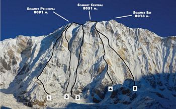 remarques: | récit sur l'expédition de l'Annapurna en 1950 par un groupe français un exploit sans pareil, une victoire de l'homme sur la montagne, le premier des plus grands sommets (plus de 8000 m) est atteint (résumé dans dossier 465C) 1/ la révolution au palais - le comité de l'Himalaya = 9 membres du clup alpin français, soit: - Maurice Herzog, chef de l'expédition - Jean Couzy, Marcel Schatz, Louis Lachenal (appelé Biscante), Lionel Terray, Gaston Rebuffat, Marcel Ichac cinéaste, Jacques Oudot médecin, Francis de Noyelle et les sherpas dont Ang-Tharkey - la chaîne de l'Himalaya, longue de 3000 km avec 200 sommets de plus de 7000 m et 14 de plus de 8000 m (dont 8 au Nepal) - le Dhaulagiri avec 8167 m et l'Annapurna avec 8079 m en plein coeur du Népal, encore jamais atteints et donc inconnus en 1950 - les 14 de plus de 8000 m: au Cachemire: K2 8611 m, Nanga Parbat 8126 m, Gasherbrum I 8068 m, Gasherbrum II 8035 m et le Broad Pik 8047 m au Nepal: Dhaulagiri 8167 m, Annapurna 8079 m, Everest 8846 m, Shisha Pangma 8046 m, Manaslu 8156 m, Makalu 8545 m, Lhotse 8515 m et Cho Oyu 8154 m au Sikkim: Kangchenjunga 8586 m mais celui qui a causé le plus de victimes jusqu'à présent, donc le plus difficile, c'est l'Annapurna, en comparaison, l'Everest offre une ascension plus facile 2/ les Iles - arrivée à New Delhi, puis au Népal le 5.4.1950, Tukucha à 2500 m est choisie comme base de départ pour l'ascension de l'Annapurna le 21.4.1950 - l'Annapurna fut choisie après que deux tentatives sur le Dhaulagiri furent trouvées trop difficiles et trop dangereuses 3/ la vallée inconnue - premier objectif: le Dhaulagiri par l'arête nord et la vallée coudée 4/ le glacier est - installation d'un premier camp sur une arête du Dhaulagiri à 5000 m 2ème échec lors de la traversée d'un glacier jugé trop dangereux - consultation auprès d'un lama (= genre de devin népalais) si l'ascension du Dhaulagiri peut se faire, le lama le leur déconseille et propose plutôt l'Annapurna 5/ à la recherche de l'Annapurna - les façes nord dans l'Himalaya sont toujours plus faciles à escalader que les façes sud - la cryopédologie = étude des sols gelés - le 14.5.1950 l'itinéraire pour l'Annapurna est repéré 6/ conseil de guerre - l'ascension de l'Annapurna se fera par la façe nord 7/ la Miristi Khola - la montée par les gorges abruptes de la Miristi Khola 8/ l'éperon - à 6000 m, le sommet de l'Annapurna se dessine la voie d'accès par l'éperon doit toutefois être abandonnée mais la rive droite du glacier de l'Annapurna est praticable - le camp I à 5000 m et le camp II à 5900 m sont installés 9/ l'Annapurna - le 23.5. la voie d'approche sur l'Annapurna est franchie - début de la mousson prévu pour le 5.6. il ne reste donc que 12 jours pour effectuer l'ascension - les camps relais sont fixés, le 24.5. le camp III est établi à 6600 m les vrais dangers sont les avalanches - p. 199 description de l'équipement 10/ la Faucille >> p. 237 quelques bonnes cigarettes pour se reposer! - en route pour le camp IV à 6850 m, puis ce sera le camp IVbis à 7150 m le 28.5. 11/ le camp II - retour au camp II pour assurer le ravitaillement >> p. 252 le brave Lionel Terray - les maux de tête dûs à l'altitude (à partir de 7000 m) se dissipent lors de la descente - le ravitaillement est bon mais la liaison radio est impossible - le 31.5. l'assaut sur l'Annapurna commence car la mousson approche et avec la mousson, toute tentative est vouée à l'échec 12/ l'assaut - l'acclimatation est un élément capital dans les expéditions himalayennes - le 2.6. en route pour le camp V à 7300 m, dernière nuit avant l'assaut final 13/ le 3.6.1950 - départ du camp V à 5 heures 30 par Herzog et Lachenal - les pieds commencent déjà à geler >> p. 290 les derniers mètres puis la victoire sur l'Annapurna à 8075 m 14/ la crevasse - Herzog et Lachenal réussissent non sans peine à rejoindre le camp V mais leurs doigts et orteils sont atteints de gélivure - la descente dans la tempête s'avère beaucoup plus périlleuse que la montée, perdus, les deux alpinistes trouvent une crevasse comme refuge pour la nuit et sont sauvés in extremis au petit matin par ceux du camp IV 15/ l'avalanche - l'arrivée au camp III après avoir essuyé une avalanche où chaque mêtre du parcours est une souffrance - théodolite = instrument de géodésie complété d'un instrument d'optique, mesurant des angles dans les deux plans horizontaux et verticaux afin de déterminer une direction n.b. ataxie: difficultés pour réaliser un mouvement sans trouble de la force musculaire; au niveau des membres inférieurs, une démarche ataxique est caractérisée par un manque d'équilibre lors de la marche et des mouvements des jambes peu précis et mal coordonnés - novocaïne, dérivé de la cocaïne, utilisé comme médicament anesthésique et anti-inflammatoire 16/ la retraite - le camp II se transforme en hôpital (6.6.1950) - après des injections anti-gélivures, la descente vers le camp I peut commencer mais la carrière de Herzog est définitivement compromise >> p. 344 la souffrance des piqûres 17/ le bois de Lete - le 10.6. la mousson est arrivée, la pluie tombe sans arrêt - le torrent Miristi est franchi in extremis - et l'expédition ne sera pas bloquée dans les montagnes de l'Annapurna - Herzog échappe de peu à la mort 18/ la procession dans les rizières - le 19.6. arrivée à Dana dans la vallée du Népal >> p. 393 une araignée de 10 cm - première amputation: le petit doigt - pénurie de coolies, arrivée à Daijing le 29.6. 19/ Gorakpur - arrivée à Tansing à la frontière de l'Inde et du Népal 20/ il y a d'autres Annapurna >> p. 430 la réception donnée par le maharajah du Népal à Katmandu - le 12.7.1950 c'est le grand départ >> un très bon livre, le récit devenant surtout captivant après avoir atteint le sommet mais, malgré de graves blessures, il n'y a pas eu de morts contrairement à p