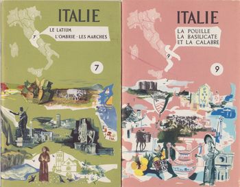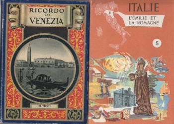 remarques: | a) série de publications régionales - no 5 l'Emilie et la Romagne (Bologne, Parme, Ravenne, St-Marin) - no 7 Latium, Ombrie et les Marches (Rome, Ancône, Pérouse) - no 9 la Pouille (Apulia), la Basilicate et Calabre (Bari, Brindisi, Lecce, Reggio) manquent les publications de: Liguria, Piemonte, Aosta, Lombardia, Trentino, Sioul Venezia Giulia, Veneto, Toscana, Abruzzi, Molise et Campania b) petite brochure "ricordo di Venezia" N&B, sd (vers 1930) |