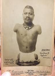 remarques: | les malformés, les oubliés de Dieu, les nouveaux monstres, les phénomènes humains 1/ l'histoire de l'homme-éléphant qui a vraiment existé à Londres vers 1862, il se nommait Joseph Carrey Merrick 2/ Taylor Barnum, créateur du grand cirque Barnum, fut le premier à exploiter commercialement les erreurs de la nature en exhibant ces phénomènes dans son cirque, il a eu la plus extraordinaire troupe de monstres de tous les temps 3/ le général Tom Pouce (Tom Thumb), fut exhibé au cirque Barnum où il fit fortune, c'est peut être le nain le plus célèbre, il s'appelait Charles Sherwood Stratton (1838-1883) et ne mesurait pas plus de 60 cm 4/ les manchots, culs-de-patte ou hommes-tronc qui ne possédent ni jambes ni bras, le plus célèbre était le prince Randian (1871-1934) qui fit une apparition dans le film freaks, avec le rôle de the living torso (torse vivant,) la scène filme une prouesse: Randian parvient à allumer une cigarette avec une allumette malgré son handicap on peut aussi mentionner l'homme à trois jambes = Francesco Lentini (1889-1966), né en Sicile qui fut aussi exhibé au sein du Barnum et Bailey circus 5/ les jumeaux siamois chez les humains, l'appellation jumeaux siamois désigne communément les jumeaux fusionnés; ce sont des jumeaux réunis par une partie de leur corps au cours du développement embryonnaire n.b. deux soeurs: Abigail et Brittany Hensel, sont nées en 1990 dans le comté de Carver, Minnesota, ce sont des jumelles bicéphales qui sont encore en vie 6/ les femmes à barbe cette anomalie est liée à un dérèglement hormonal entraînant un hirsutisme = pilosité accrue 7/ les nains (lilliputiens) de 60 à 80 cm et les géants (brobdingnagiens) de 2 à 3.- m de taille, les cas de nanisme et de gigantisme 8/ le film de monstres (1932): freaks produit par Tod Browning 9/ les personnes obèses (300 à 400 kg) et squelettiques (12 kg) >> des malformations assez rares mais réelles et qui ne sont plus aujourd'hui sujets à exhibition |