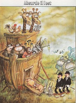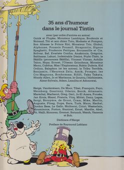 remarques: | 35 ans du journal Tintin, 35 ans d'humour, l'extraordinaire histoire de l'hebdomadaire des super-jeunes de Achillon Talon à l'Heureux Zélu, de Attanasio à (A)zara, de 1946 à nos jours et de 7 à 77 ans - dédicace d'Hergé avec ses félicitations (mais peu méritées pour cet album) - préface de Raymond Leblanc, créateur avec Hergé du Journal de Tintin répertoire pas très chronologique des dessinateurs et de leurs séries: 1947 Hergé (Quick et Flupke), 1949 Vandersteen (Lambique, Bob et Bobette + le prince Riri), 1950 Bob de Moor (Mr. Tric), 1952 Tibet, 1954 Weinberg, 1955 Franquin (Modeste et Pompon), 1957 Uderzo (Poussin et Poussif), 1958 Attanasio (Spaghetti), Berck (Strapontin) et Maréchal (Madame Petitpas), 1960 Machereot, 1961 Fonske (Anakronis), 1963 Geri, 1965 Kruis (Grégoire) et Mazel, 1966 Vicq, Dany, De Moor (Balthazar) et Mitteï (indésirable Désirée), 1966 Attanasio reprend Modeste et Pompon, Sergi, Brouyère, Greg (Achille Talon), Turk+De Groot (Robin Dubois) 1967 Ploeg + Lagas, 1968 Dupa (Cubitus), Bara (Max) 1969 Tibet (Kid Ordinn), Gordon Bess (la tribu terrible) 1974 Wasterlain, 1976 Mouminoux (Rififi), 1977 Forton, 1978 Azara (Taka Takata), 1979 Ernst, 1980 Walli, 1981 Bob (Adonowai) n.b. une double page originale par Bob de Moor (1966): "il y a 20 ans au 55, rue Lombard" >> ce sera un pot-pourri des séries de bande dessinées parues dans le journal de Tintin de 1946 à 1981, mais sans mentionner les meilleures séries des premières années et la plupart des séries présentées dans ce volume ne sont pas les plus intéressantes à part quelques unes telle que p. 8/9 Quick et Flupke, p. 13 Modeste et Pompon, p. 14 prince Riri, p. 16/17 M. Tric, p. 25-27 Uderzo, p. 37 une planche de Macherot, p. 80/81 Achille Talon en N&B, p. 96/97 Kid Ordinn, p. 110/111 Wasterlain, les autres séries présentées n'étant pas vraiment de grand intérêt >> un album édité plus pour des raisons économiques qu'artistiques, 35 ans d'humour mais aussi 35 ans de déchéance annexes - couverture Ier et 4ème plat de l'album - un pastiche sur les deux Dupondt par Watch = Pierre Wattiez alias Watch, dessinateur, travaillant surtout pour le journal Spirou |