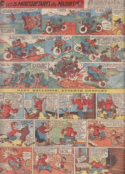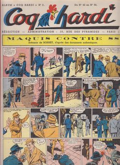 remarques: | album Coq Hardi no 3, 3ème année, Nouvelle Série no 42 (9.1.1947) au no 54 (1947) à partir du no 51 (13.3.1947), la datation n'est plus mentionnée continuation des séries existantes avec toujours - guerre à la terre, les trois mousquetaires du maquis, Lariflette et capitaine fantôme, Pancho Libertas a maintenant comme titre "les desperados" début de trois nouvelles séries - maquis contre SS par Poïvet (au no 54) - le prof. Tribacil et les Astériens par Erik et - Baby Baluchon, athlète complet par Mat >>> le journal Coq Hardi se porte toujours bien mais la qualité du papier a retrouvé son ancienne impression |