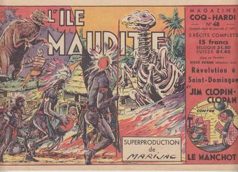 remarques: | magazine Coq-Hardi no 48, supplément au no 147, 1ère série, 3 récits complets, pour fr 15.- couverture super production Marijac les 3 récits complets: - Jim Boum dans l'île maudite (Marijac) - Jim Clopin-Clopan, pionnier du Far-West, contre Le Manchot (Marijac) + 1 feuilleton: révolution à Saint-Domingue numéro collectionné à titre d'exemplaire représentatif de la série |