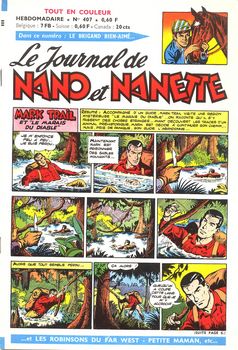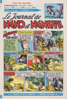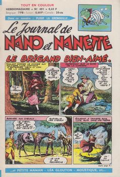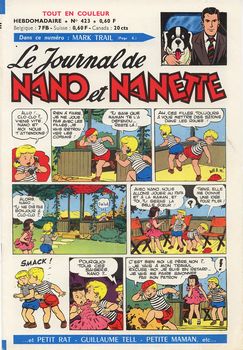 remarques: | le Journal de Nano et Nanette hebdomadaire, 18 pages, au prix de fr 0,60 série de 31 fascicules du no 400 (13.10.1964) au no 430 (11.5.1965) bandes principales: - Nano et Nanette (Rod) - le brigand bien-aimé - fleur d'Andalousie (Gloesner) - Mark Trail (Dodd) - Burma Belle (bd d'origine anglaise) - petite maman - Patos enfant de la brousse (Marijac) - Moustique, mousquetaire du roi (Le Rallic) - Léa Glouton (Parlett) - les Robinsons du Far West - P'tit rat (Gloesner) - Coquin et Patamousse (Calvo) - Fanfan la tulipe (Le Rallic) n.b. cette bande fut reprise dans l'Intrépide en version plus complète - Guillaume Tell - Baptistou, le petit lièvre intrépide (Calvo) - Tina la petite poupée + une série documentaire sur la bande dessinée par Claude Marin du no 417 au 425 1/ la technique 2/ le scénario 3/ les pionniers 4/ Hergé 5/ Marijac 6/ Morris le père de Lucky Luke 7+8/ les collaborateurs du journal Nano et Nanette 9/ conclusion avec une photo de Marijac avec les grands noms de la bande dessinée (1965): Jideheur, Charlier, Goscinny, Hergé, Alain Saint-Ogan, Pat Sullivan, Walt Disney, Marijac, Greg, Morris, Gloesner, Marin, Duteurtre, Mathelot, Novi, Gaty, Trubert, Le Rallic et Forest, mais de nombreux autres ne sont pas mentionnés, citons jusqu'encore: Uderzo, Liquois, Dax, Niezab, Giffey, Calvo, etc >> à nouveau de très bonnes bandes dessinées avec surtout Le Rallic, Gloesner et Calvo |
